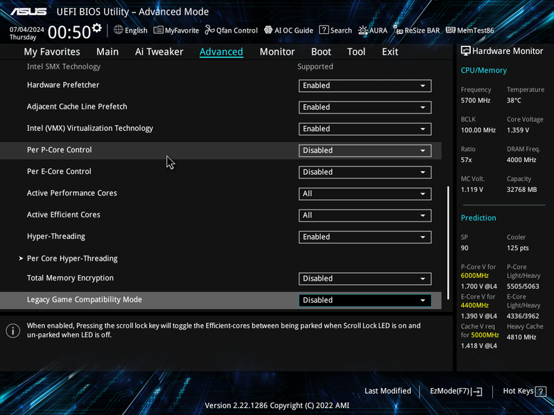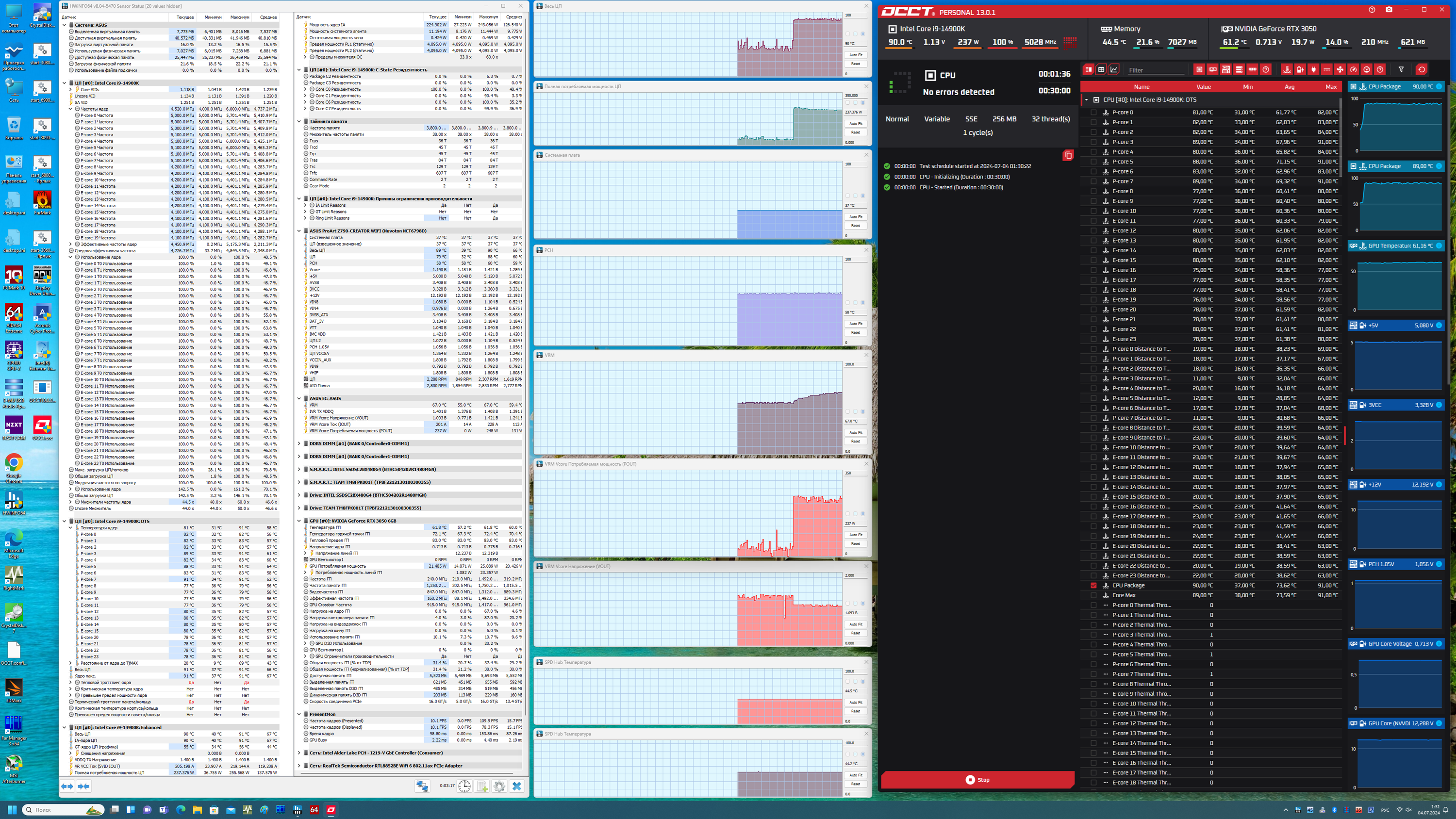 Для неигрового решения это весьма хороший результат: мы получили 5,1 ГГц по всем P-ядрам и 4,2 ГГц по всем Е-ядрам (понятно, что изначально система питания запроектирована была в чуть урезанном виде – не 2 коннектора по 8-контактов, а 8 плюс 4, поэтому получаемых на топовых игровых матплатах 5,7/4,4 ГГц тут мы точно не получим). Стоит напомнить, что Р-ядра — это обычные всем привычные ядра, имеющие по 2 потока каждый, «Р» — означает Performance, то есть производительные. «Е» — это энергоэффективные ядра, так называемые, малые ядра, у них по 1 потоку. В целом мы видим, что система по умолчанию, определив все же достаточно мощное питание матплаты, выставила приличный авторазгон. Собственно, для такого продукта большего и не требуется.