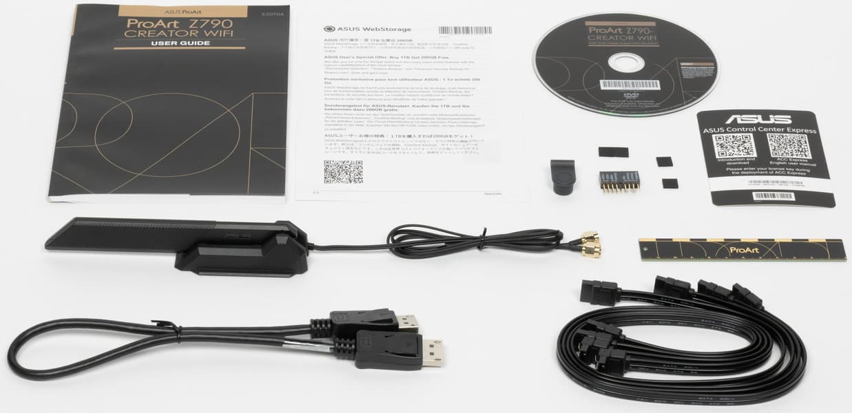 Кроме традиционных элементов типа руководства пользователя и кабелей SATA, комплект поставки включает антенну встроенного Wi-Fi-модуля, адаптеры DisplayPort (позволяющие подключить вывод с дискретной карты к универсальным выводам через Intel Thunderbolt), накопитель с ПО, сувенирная линейка и фирменный Q-connector – адаптер для удобного подключения кабелей от передней панели корпуса.