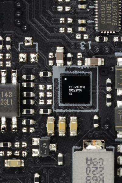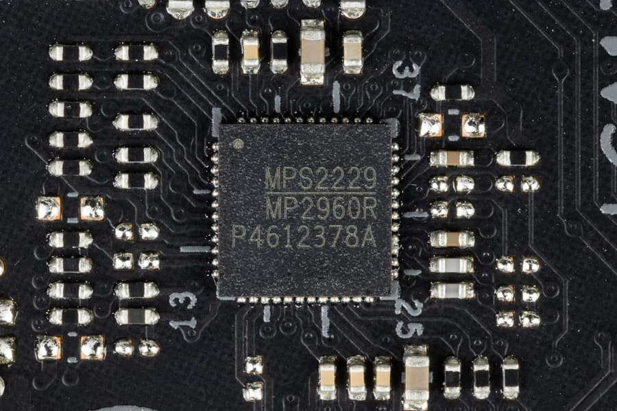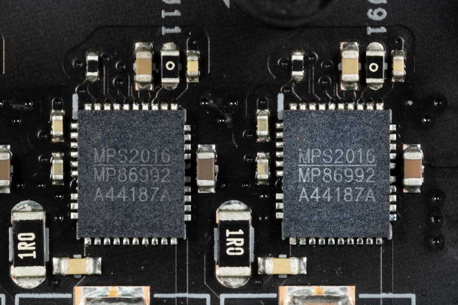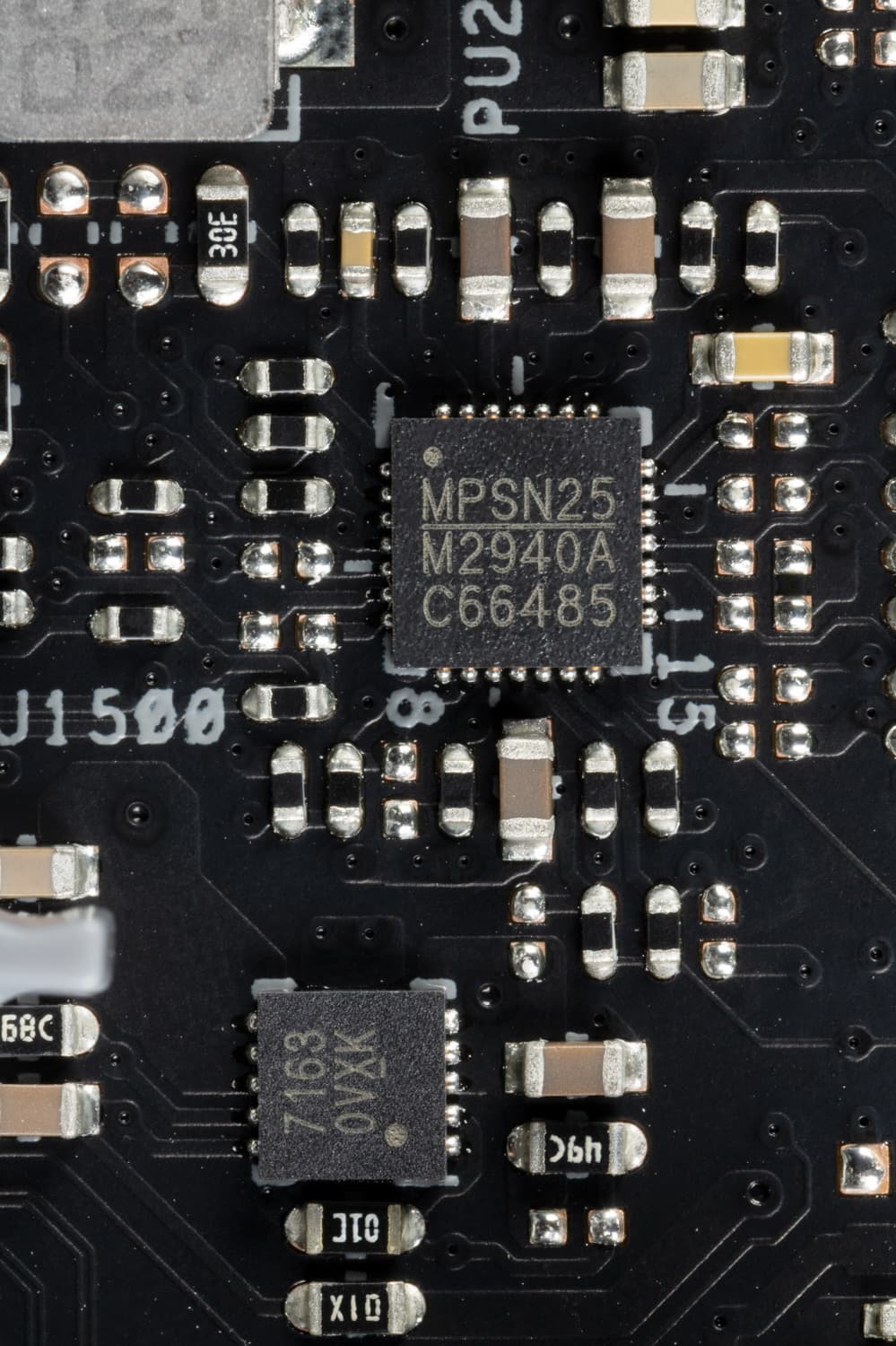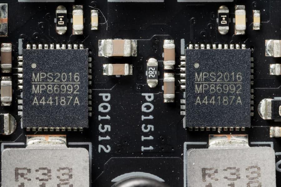 Каждый канал фазы имеет суперферритовый дроссель и MP86992 MOSFET от Monolithic Power Systems на 60 А.
