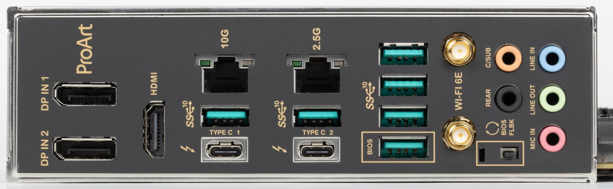 - 8 портов USB 3.2 Gen2: 6 реализованы через Z790 и представлены на задней панели портами Type-A (голубого цвета); 2 реализованы через контроллер Intel Thunderbolt 4 (на него потрачены 4 линии PCIe 3.0) и представлены на задней панели портами Type-C;