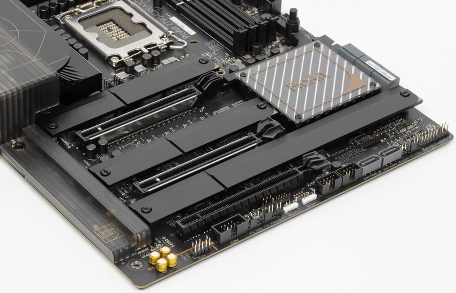 Как я уже упоминал ранее, M.2 слоты также имеют радиаторы: у верхнего и среднего — свои персональные радиаторы, у двух нижних — общий.