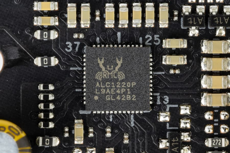 Аудиотракт вынесен на угловую часть платы, не пересекается с другими элементами. Все аудиоразъемы на задней панели имеют привычную цветовую окраску.