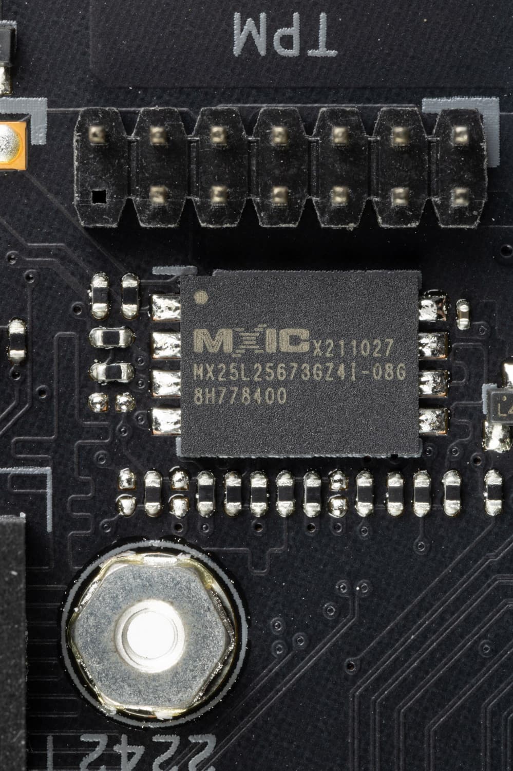 Особо надо отметить, что порт USB 3.2 Gen2x2, выполненный в виде внутреннего Type-C, имеет функцию ускоренной подзарядки внешних устройств (до 60 Вт по технологии Quick Charge 4+), для этого обязательно надо подключить питание через 6-контактный разъем рядом с основным 24-контактным разъемом. Управляет такой быстрой подзарядкой контроллер от Texas Instruments.