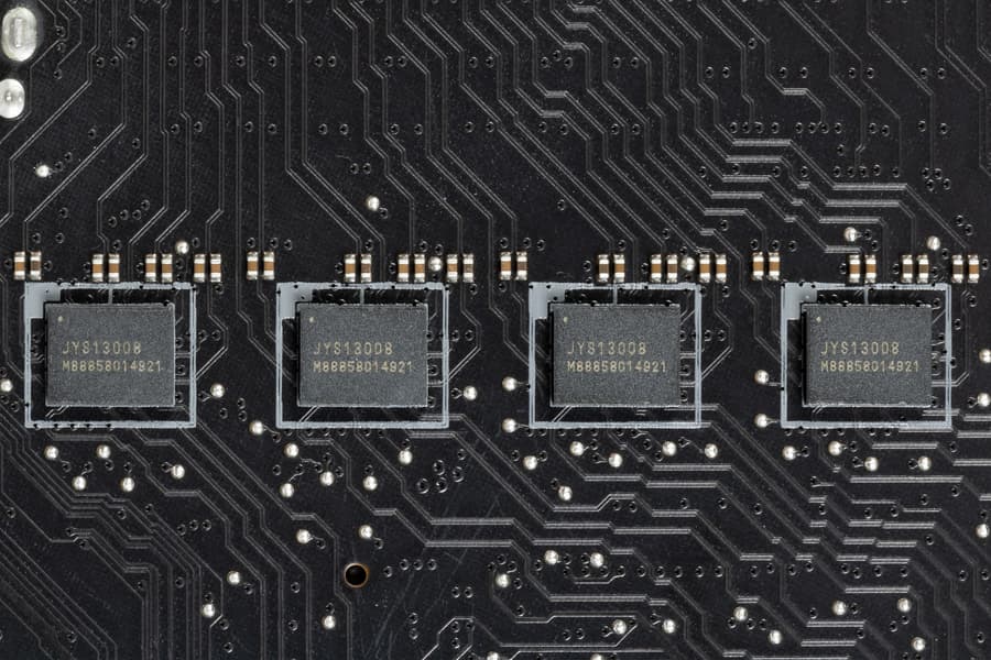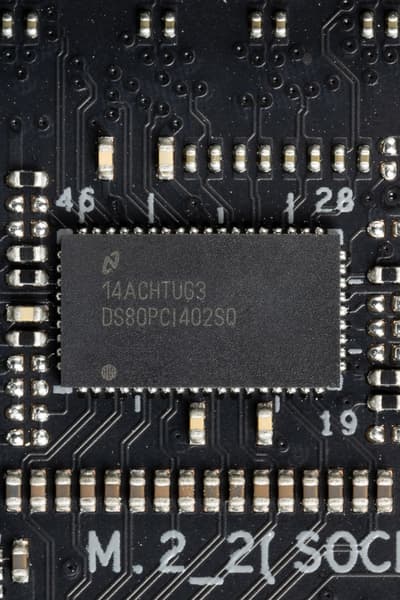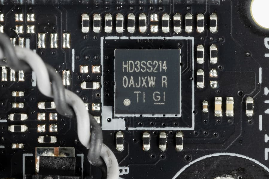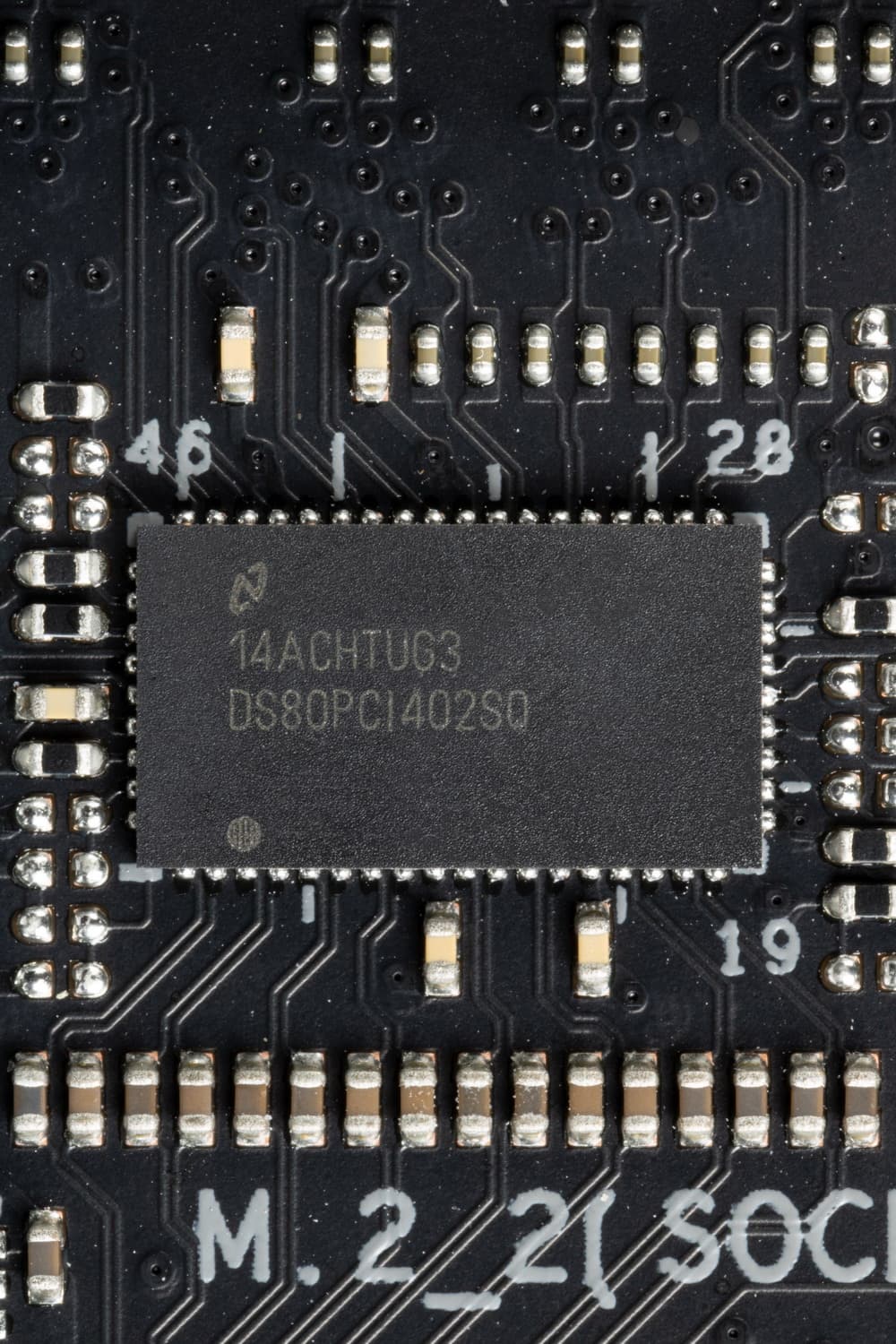 Для поддержания стабильности шины PCIe 4.0 имеется усилитель сигнала DS80PCI402 от Texas Instruments.
