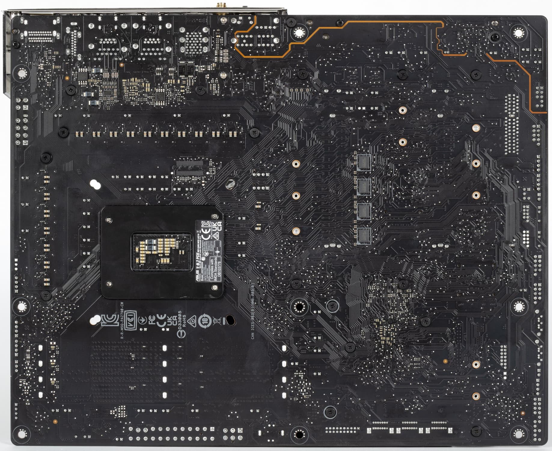 Эта модель не относится к семейству ROG, но система питания процессора у нее все же весьма мощная, способная обеспечить работу любых совместимых процессоров с некоторым запасом на разгон. Плата имеет эффективную систему охлаждения каждого потенциально греющегося элемента, включая накопители в слотах M.2. Стоит отметить и отличные сетевые возможности: два проводных контроллера 2,5 и 10 Гбит/с, а также беспроводной Wi-Fi 6 + Bluetooth 5.2. Поддержка Thunderbolt 4 позволяет передавать данные на скорости 40 Гбит/с, также имеется возможность выводить картинку на приемник с интерфейсом Thunderbolt 4. По поводу подсветки можно сказать, что плата поддерживает подключение разных современных наборов ARGB/RGB, но сама по себе подсветки лишена.