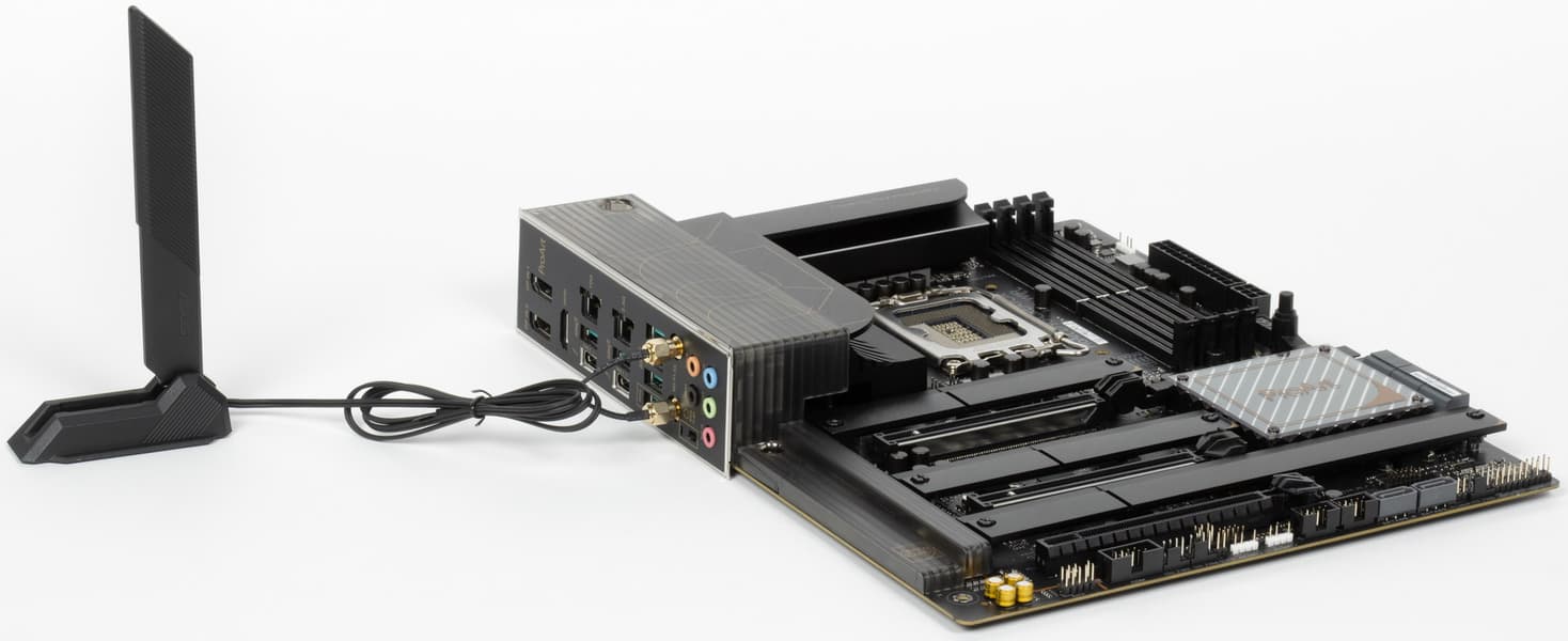 У платы 15 портов USB разных видов, включая 1 USB 3.2 Gen2×2 (с функцией быстрой зарядки мобильных устройств) и 8 USB 3.2 Gen2, два из которых поддерживают режим Thunderbolt 4. Плата имеет 3 слота PCIe х16 (два из которых подключены к процессору 16 линиями PCIe 5.0 и могут работать одновременно в режиме х8+х8, а третий подключен к чипсету и работает в режиме х4), также вы получаете 4 слота M.2 (один из них подключен напрямую к процессору линиями PCIe 4.0, три других подключены к чипсету Z790 линиями PCIe 4.0), 8 портов SATA (4 из них делят ресурсы с одним из слотов М.2) и 8 разъемов для вентиляторов.
