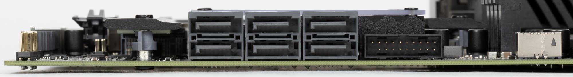 Всего у платы 8 разъемов Serial ATA 6 Гбит/с + 4 слота для накопителей в форм-факторе M.2. Все 8 портов SATA реализованы через чипсет Z790 и поддерживают создание RAID. 6 портов имеют горизонтальную ориентацию и размещены в едином «двухэтажном» блоке на правом конце платы, а 2 порта выполнены в вертикальной ориентации и размещены на нижнем конце платы.