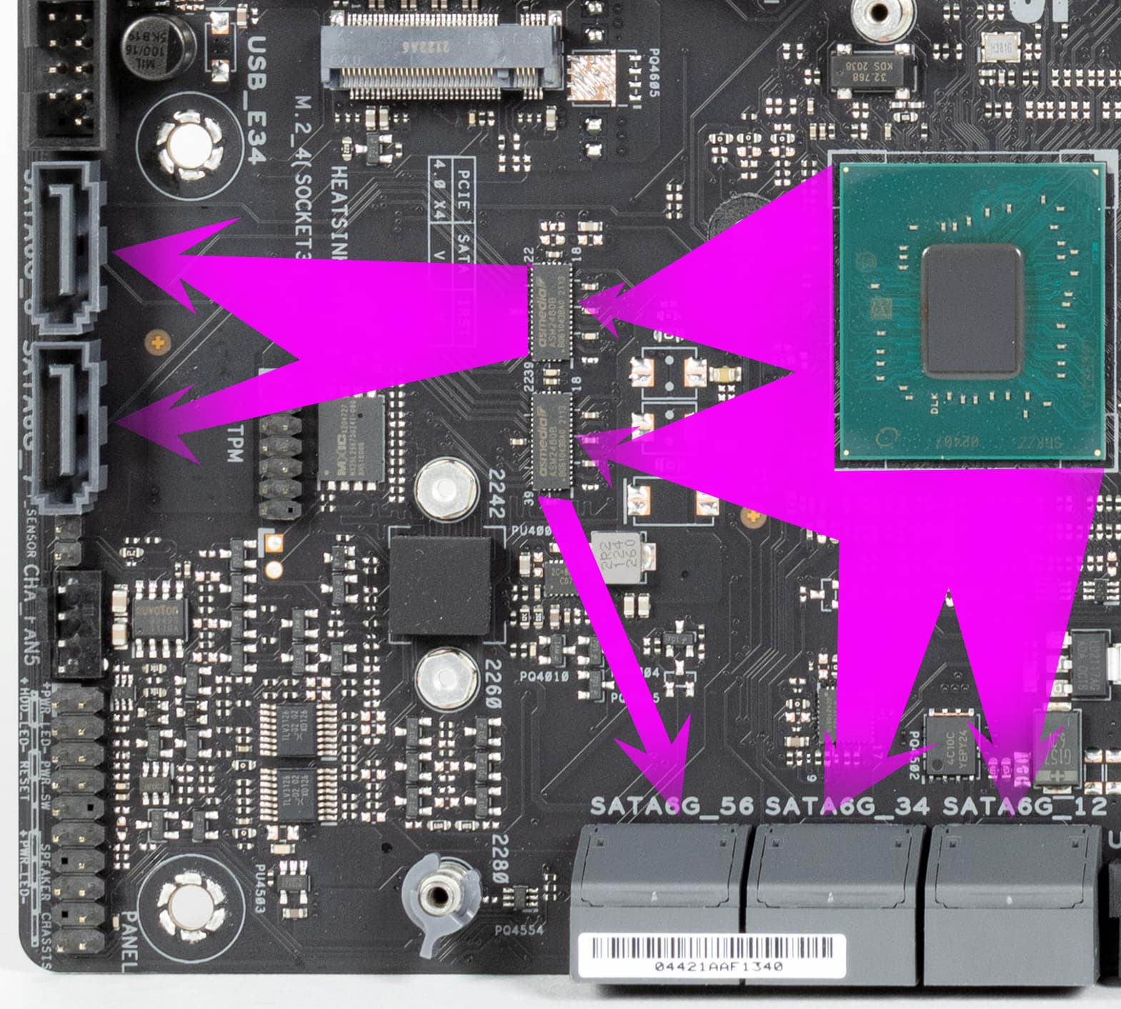 Учитывая тот фактор, что у материнской платы достаточно широкий набор периферии, ресурсов на все и вся без разделения не хватает, поэтому порты SATA 5, 6, 7, 8 делят линии со слотом М.2_4 (то есть если последний занят, то порты SATA 5, 6, 7 и 8 автоматически отключены, и наоборот: если хотя бы один из указанных портов SATA занят, что слот М.2_4 отключается).