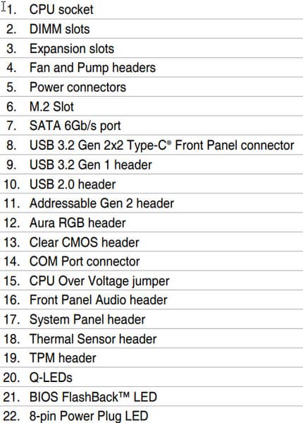 | Прочие внутренние элементы | 24-контактный разъем питания ATX 1 8-контактный разъем питания EPS12V 1 4-контактный разъем питания EPS12V 1 6-контактный разъем питания PCIe 1 слот M.2 (E-key), занят адаптером беспроводных сетей 1 разъем для подключения порта USB 3.2 Gen2x2 Type-C 1 разъем для подключения 2 портов USB 3.2 Gen1 2 разъема для подключения 4 портов USB 2.0 8 разъемов для подключения 4-контактных вентиляторов и помп ЖСО 1 разъем для подключения неадресуемой RGB-ленты 3 разъема для подключения адресуемой ARGB-ленты 1 разъем аудио для передней панели корпуса 1 разъем COM-порт 1 разъем CPU_OV 1 разъем TPM для устройств безопасности 1 разъем для термодатчика 1 разъем для сброса CMOS 2 разъема для подключения управления с передней панели корпуса |