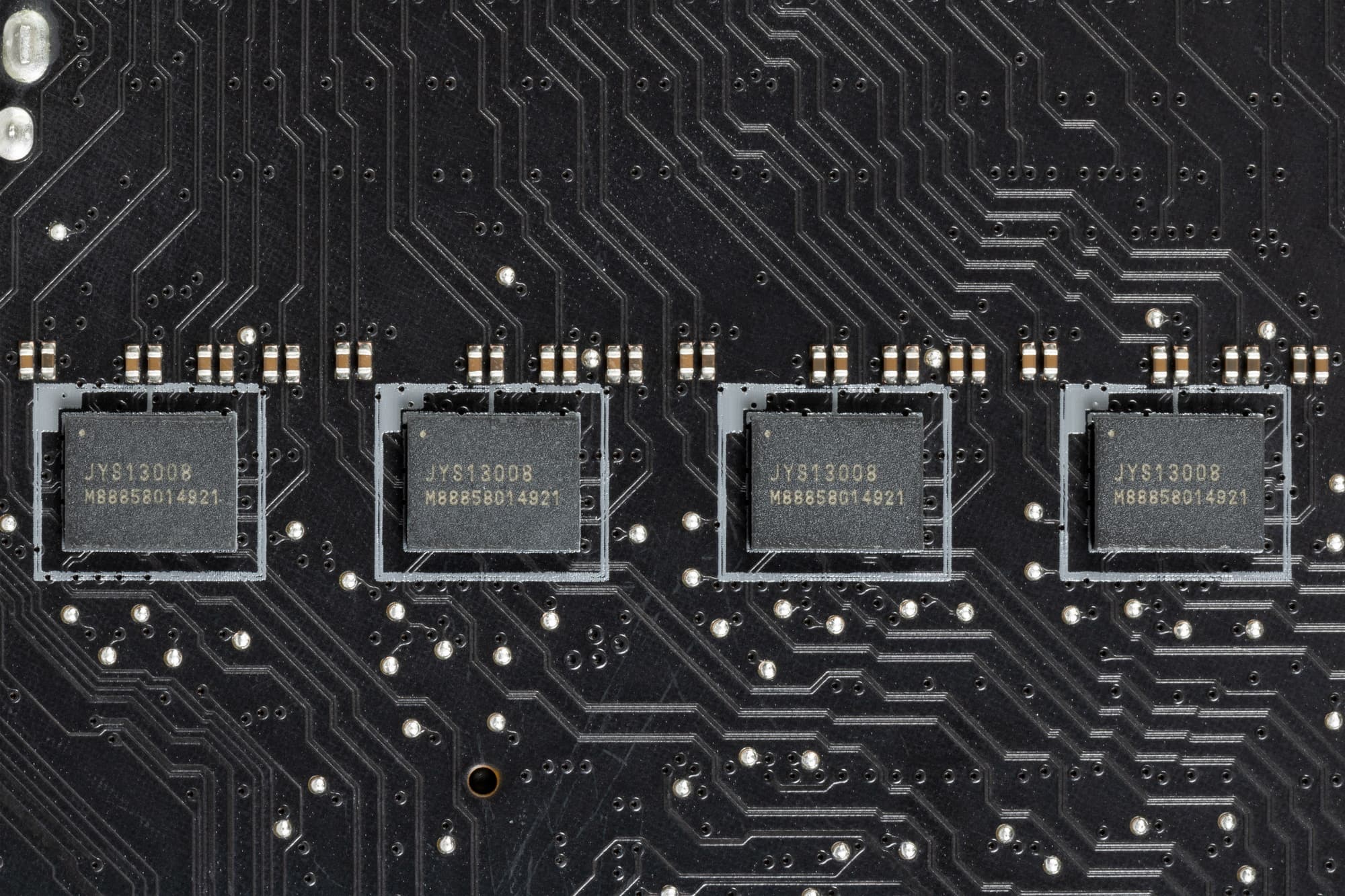На оборотной стороне почти ничего нет (кроме ряда микросхем – усилителей PCIe 5.0 сигнала). Текстолит обработан не очень хорошо: не во всех точках пайки острые концы как следует срезаны. Бэкплейта нет.