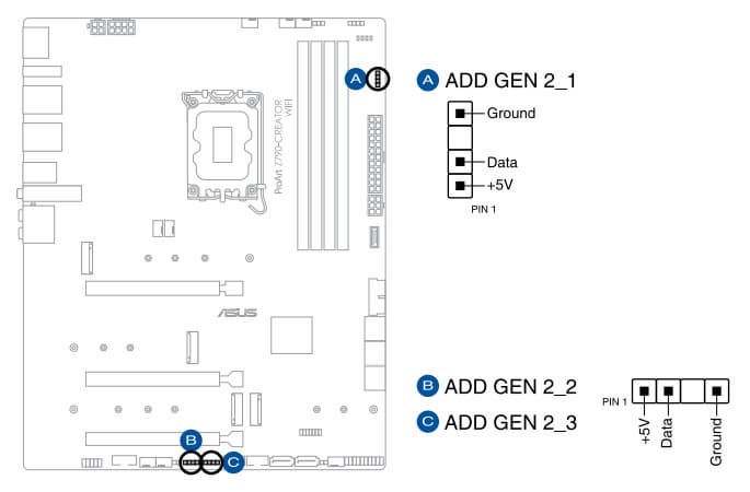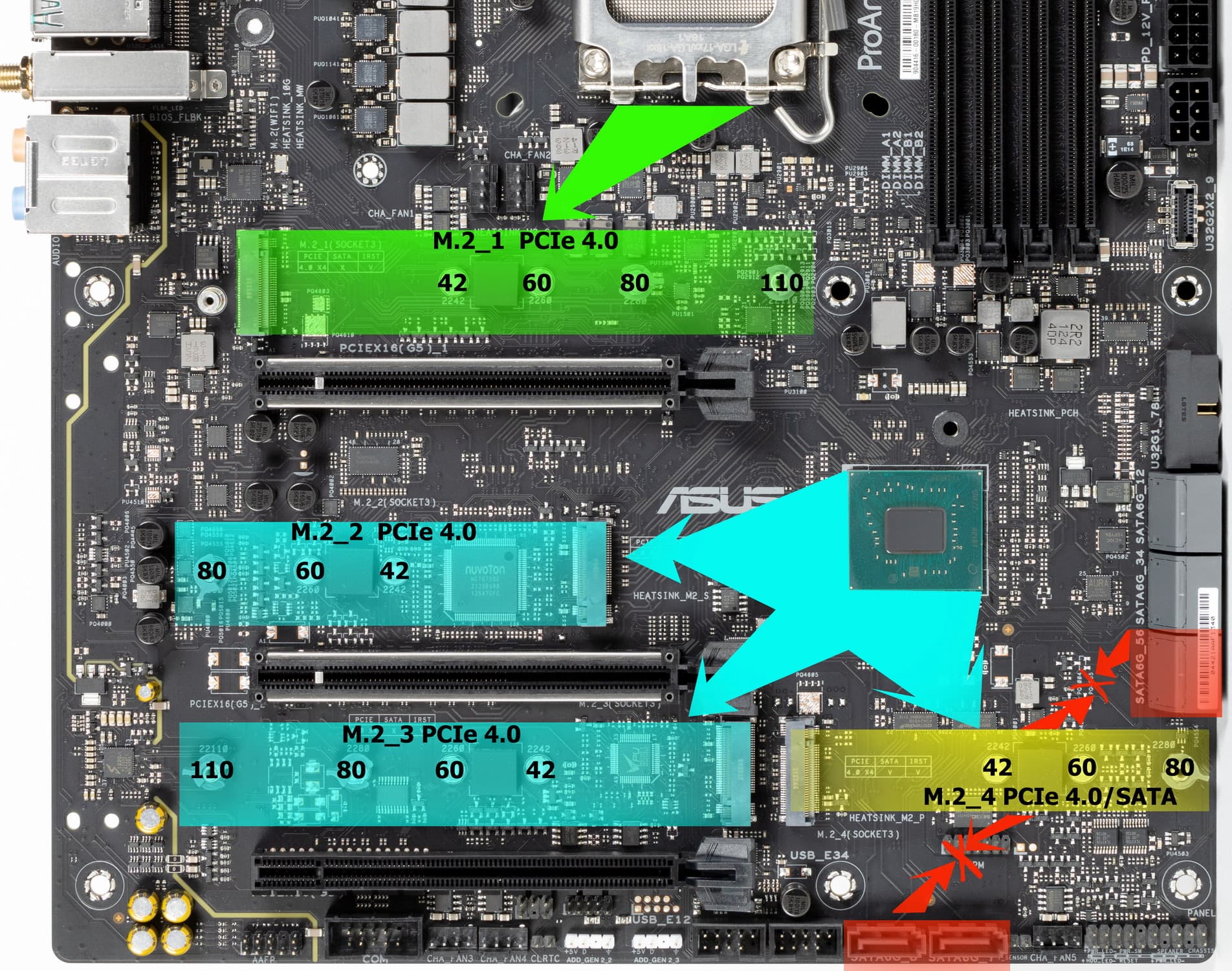 Второй, третий и четвертый слоты M.2 (M2_2, M2_3, М2_4) получают данные от чипсета Z790, а первый — от CPU (PCIe 4.0). При этом только М2_4 (PCIe 4.0) поддерживает модули с любым интерфейсом, а все остальные работают с модулями только с PCIe интерфейсом.
