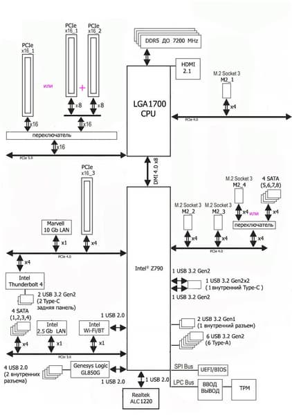 Процессоры Intel Core 14/13/12-го поколений (совместимые с сокетом LGA1700 и поддерживаемые Z790) имеют 20 линий ввода-вывода (16 PCIe 5.0, 4 PCIe 4.0), не имеют USB и SATA портов. При этом взаимодействие с Z790 идет по особому каналу Digital Media Interface 4.0 (DMI 4.0 x8). Все PCIe линии процессора идут на слоты расширения PCIe и порт М.2. Serial Peripheral Interface (SPI) используется для взаимодействия с системой UEFI/BIOS, а шина Low Pin Count (LPC) — для связи с устройствами ввода/вывода, не требующими высокой пропускной способности (контроллерами вентиляторов, TPM, старой периферии).