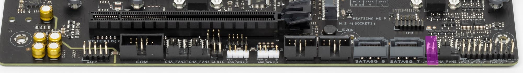 Теперь в целом про слоты PCIe. Всего на плате есть 3 слота: два PCIe x16 (для видеокарт или других устройств) и один PCIe x16_3 (де-факто имеющий 4 линии PCIe 3.0). Если про первые PCIe x16_1/2 я выше уже рассказал (они подключены к CPU), то PCIe x16_3 подключен к Z790 в режиме PCIe x4 версии PCIe 3.0.