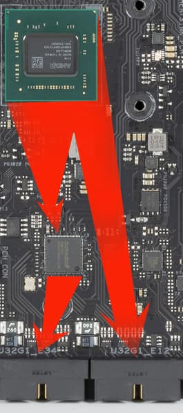 Два длинных («процессорных») слота PCIe x16 имеют металлическое армирование из нержавеющей стали, которое увеличивает их надежность (что может быть важным в случае довольно частой смены видеокарт, но что более важно: такой слот легче выдержит нагрузку на изгиб в случае установки очень тяжелой видеокарты топового уровня. Кроме того, такая защита предохраняет слоты от электромагнитных помех.
