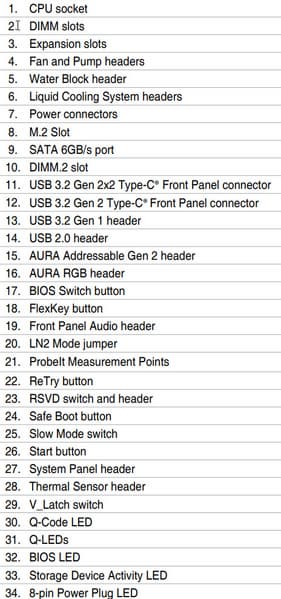 | Прочие внутренние элементы | 24-контактный разъем питания ATX 2 8-контактный разъем питания EPS12V 1 6-контактный разъем питания PCIe12V 1 слот M.2 (E-key), занят адаптером беспроводных сетей 1 разъем для подключения порта USB 3.2 Gen2x2 Type-C 1 разъем для подключения порта USB 3.2 Gen2 Type-C 2 разъема для подключения 4 портов USB 3.2 Gen1 2 разъема для подключения 4 портов USB 2.0 8 разъемов для подключения 4-контактных вентиляторов и помп ЖСО 1 разъем для подключения неадресуемой RGB-ленты 3 разъема для подключения адресуемой ARGB-ленты 1 разъем аудио для передней панели корпуса 1 разъем для сброса CMOS 1 кнопка OC Retry 1 кнопка Safe Boot 1 переключатель Slow Mode 1 переключатель V_Latch 1 разъем для термодатчикa 3 разъема подключения фирменных помп СВО Asus 2 разъема для подключения управления с передней панели корпуса 1 кнопка включения питания Power 1 кнопка перезагрузки Reset |