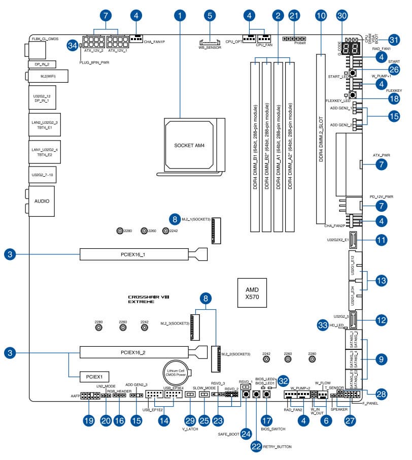 У Asus ROG Crosshair VIII Extreme имеется 20 портов USB разных видов, включая 11 очень быстрых USB 3.2 Gen2, два из которых поддерживают Thunderbolt 4, а еще есть один самый быстрый USB 3.2 Gen2×2 — правда, в виде внутреннего Type-C, для вывода которого еще придется поискать корпус. Плата предлагает 2 слота PCIe х16 (они получают от процессора 16 линий PCIe), слот PCIe x1, аж 5(!) слотов M.2 (один из них подключен напрямую к процессору линиями PCIe 4.0, еще два также могут подключаться к процессору, но для этого придется уменьшить количество линий PCIe для слотов PCIe x16).
