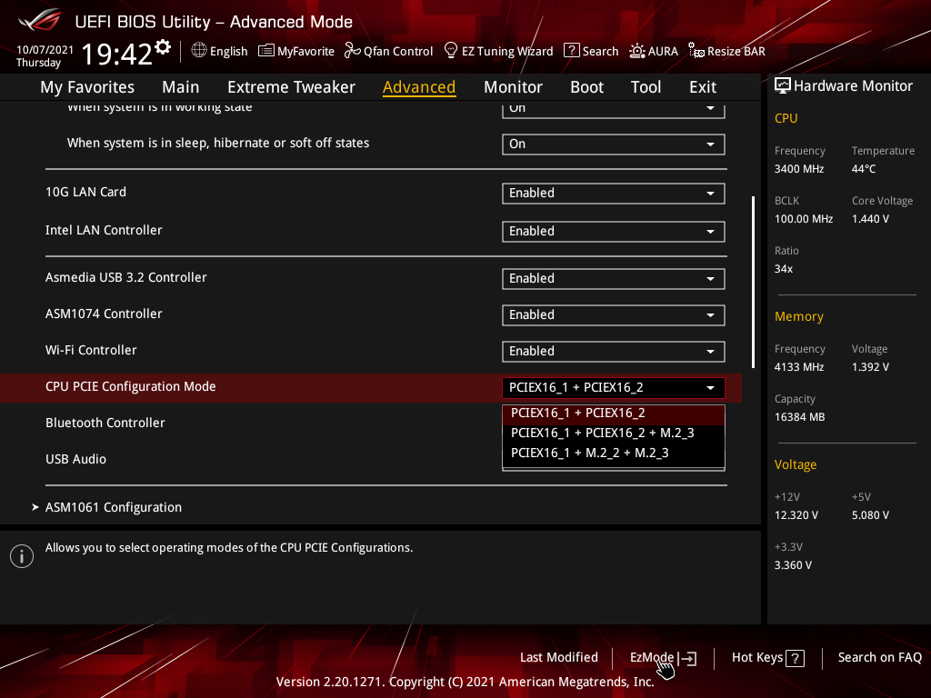 Теперь посмотрим выше на то, как работают процессоры в данной конфигурации. У всех Ryzen – 20 линий PCIe (плюс 4 линии на даунлинк с чипсетом). 4 линии уходят на слот M.2_1, а остальные 16 линий надо делить на два слота PCIe x16 (_1 и _2), а также на два порта М2_2/2_3 (которые также «питаются данными» от процессора). Вариантов переключения несколько: