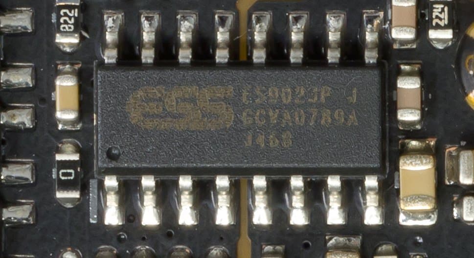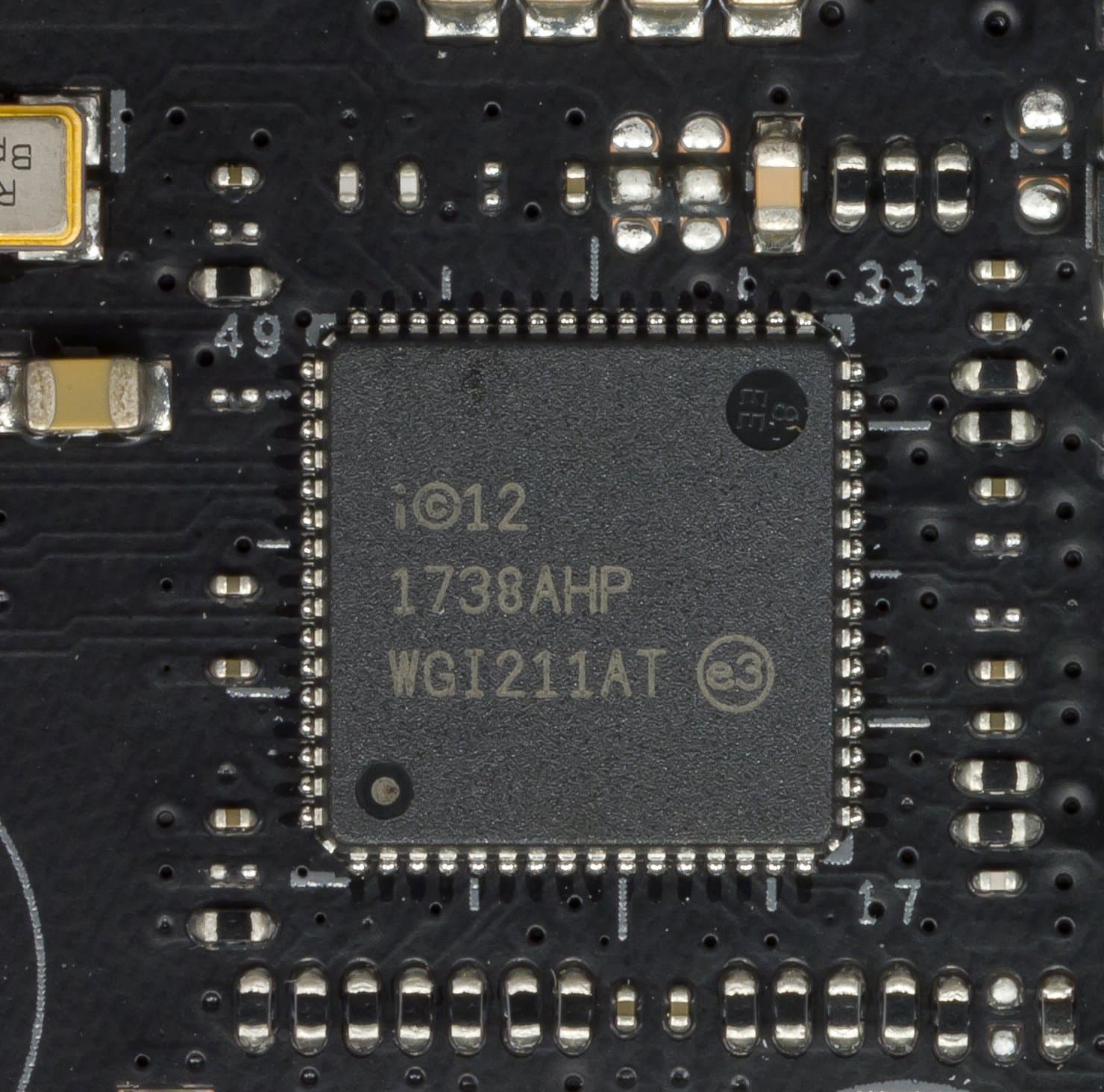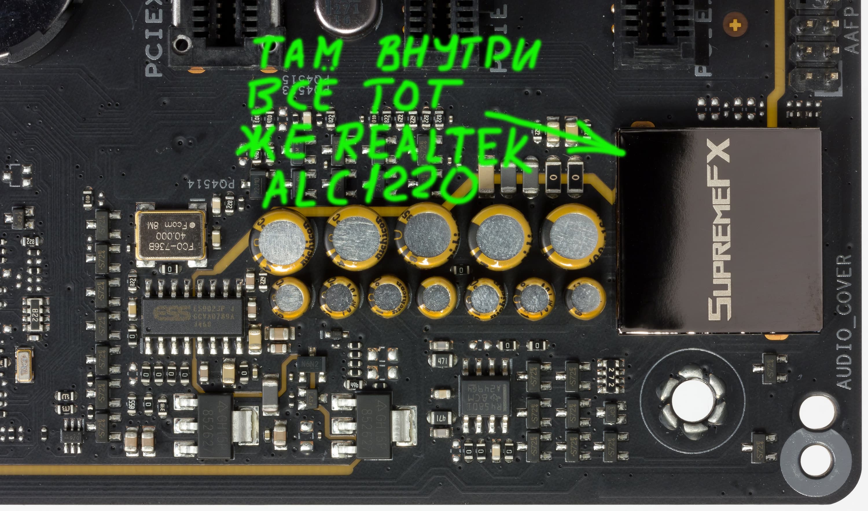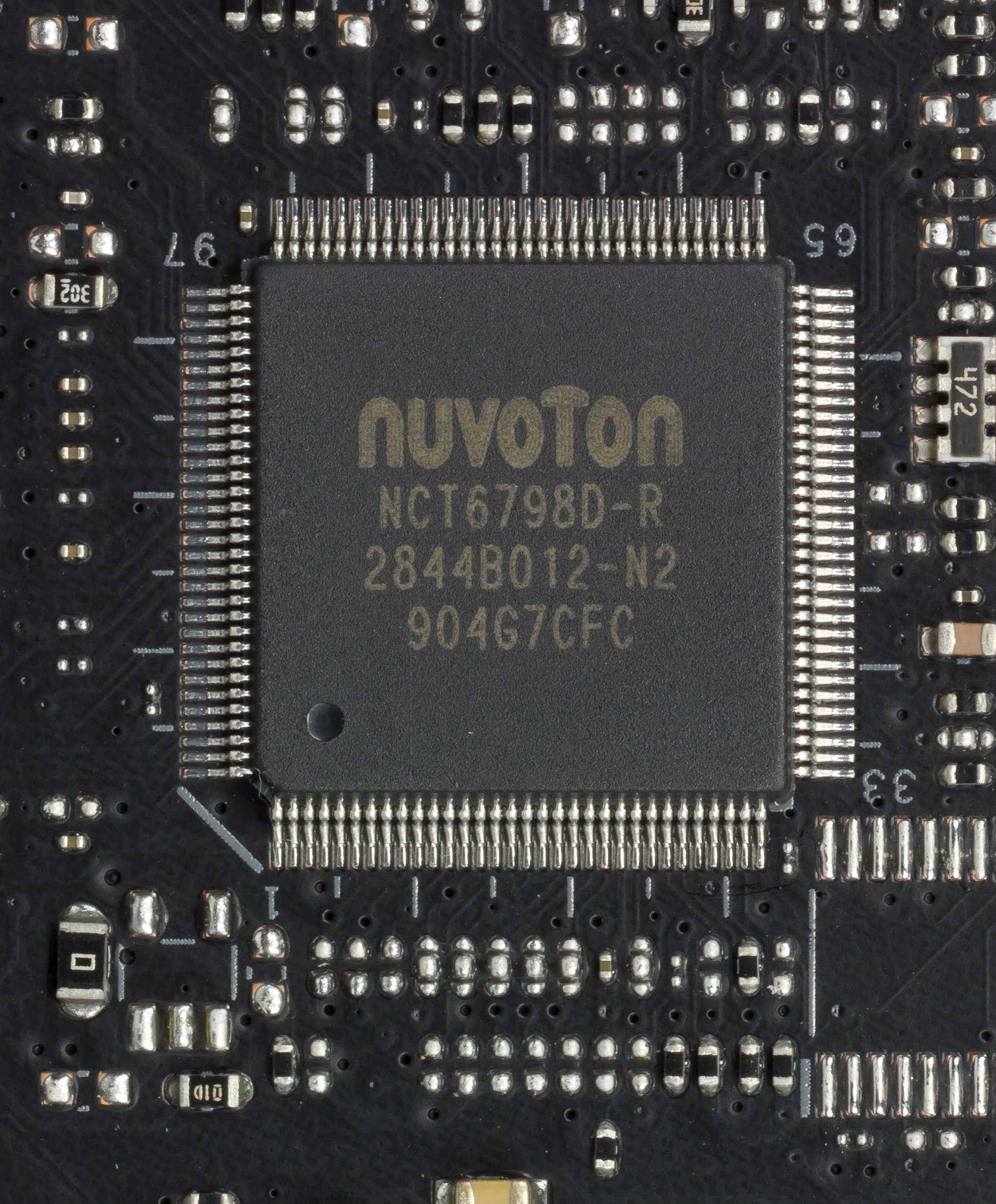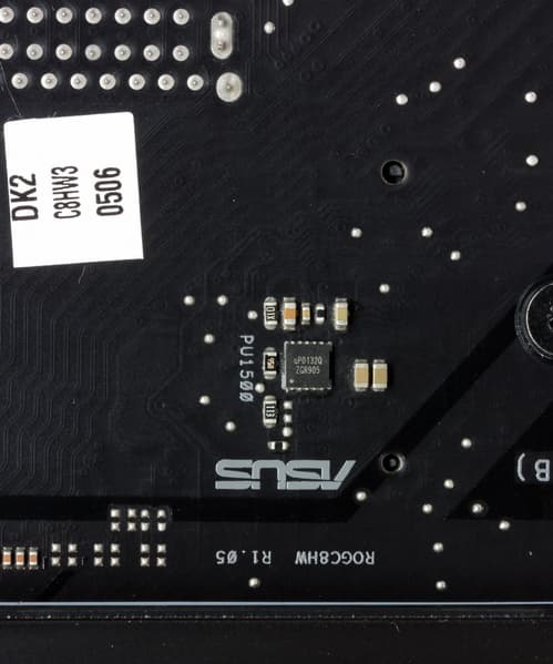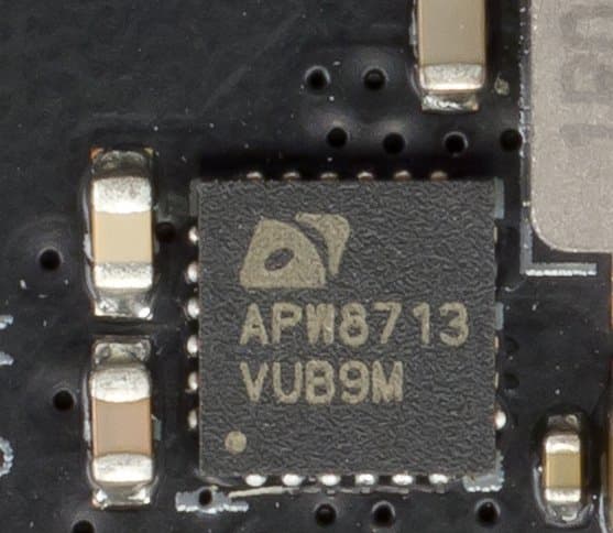 Контроль по синхронизации работы подсветки возложен на чип Aura 50QА0 (не удалось выяснить, как оригинально назывался чип и кто его производитель), который на сей раз производитель так запрятал под замок слота PCI-Ex16, что даже сфотографировать его получилось не с первого раза.