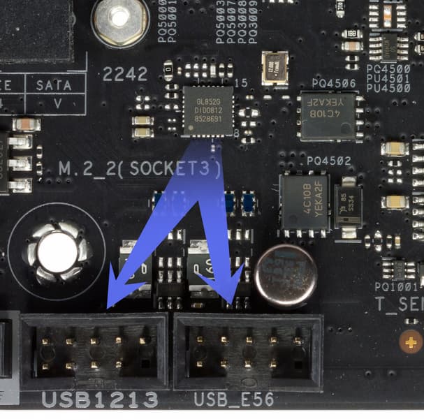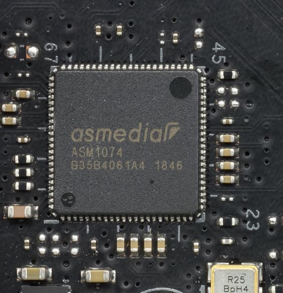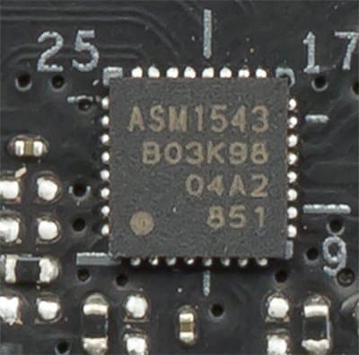 - 6 портов USB 3.2 Gen1: 4 из них реализованы через контроллер ASM1074 от ASmedia и представлены на задней панели 4 портами Type-A (синие); остальные 2 реализованы через X570 и представлены внутренним разъемом на материнской плате на 2 порта;