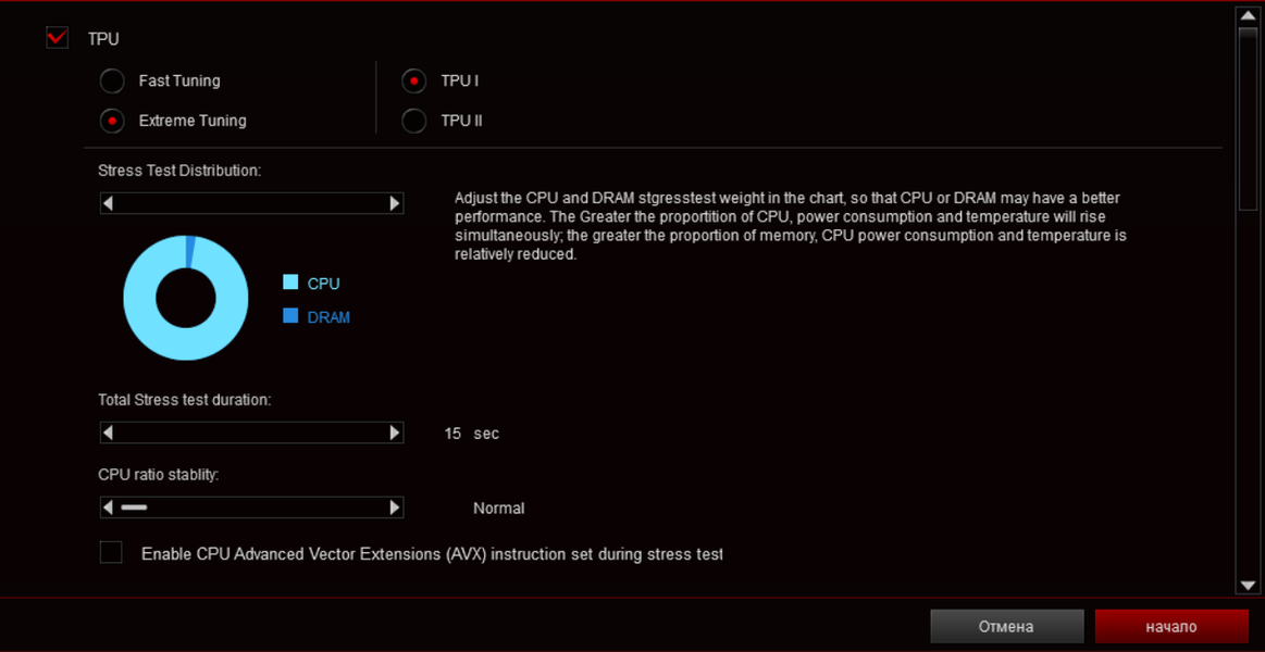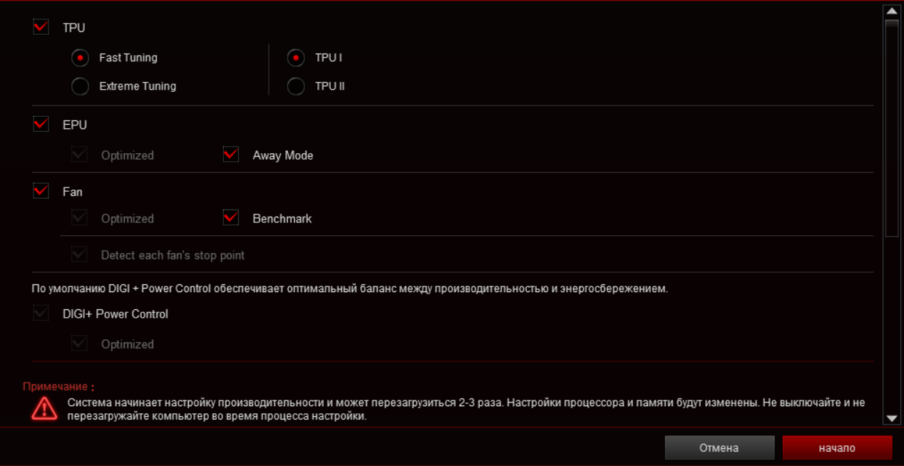 Как-то даже был разочарован. Там просто кликом мышки включил «Asus Optimal» без всяких перезагрузок, и все. А тут пыжилось, пыжилось оно... А результат тот же. Не, это не годится. Идем дальше в раздел TPU в программе и там запускаем уже более сильный автооверклокинг.