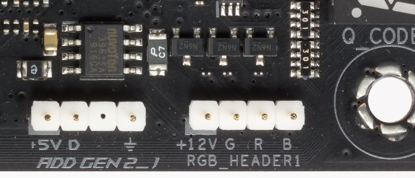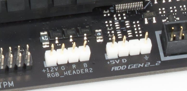 Продолжая разговор о световых индикаторах, надо упомянуть и возможности материнской платы по подключению RGB-подсветки. Имеется четыре разъема для подключения любых устройств этого плана: 2 разъема для подключения адресуемых (5 B 3 A, до 15 Вт) ARGB-лент/устройств и 2 разъема неадресуемых (12 В 3 А, до 36 Вт) RGB-лент/устройств. Разъемы объединены в пары: одна (RGB+ARGB) — находится наверху платы