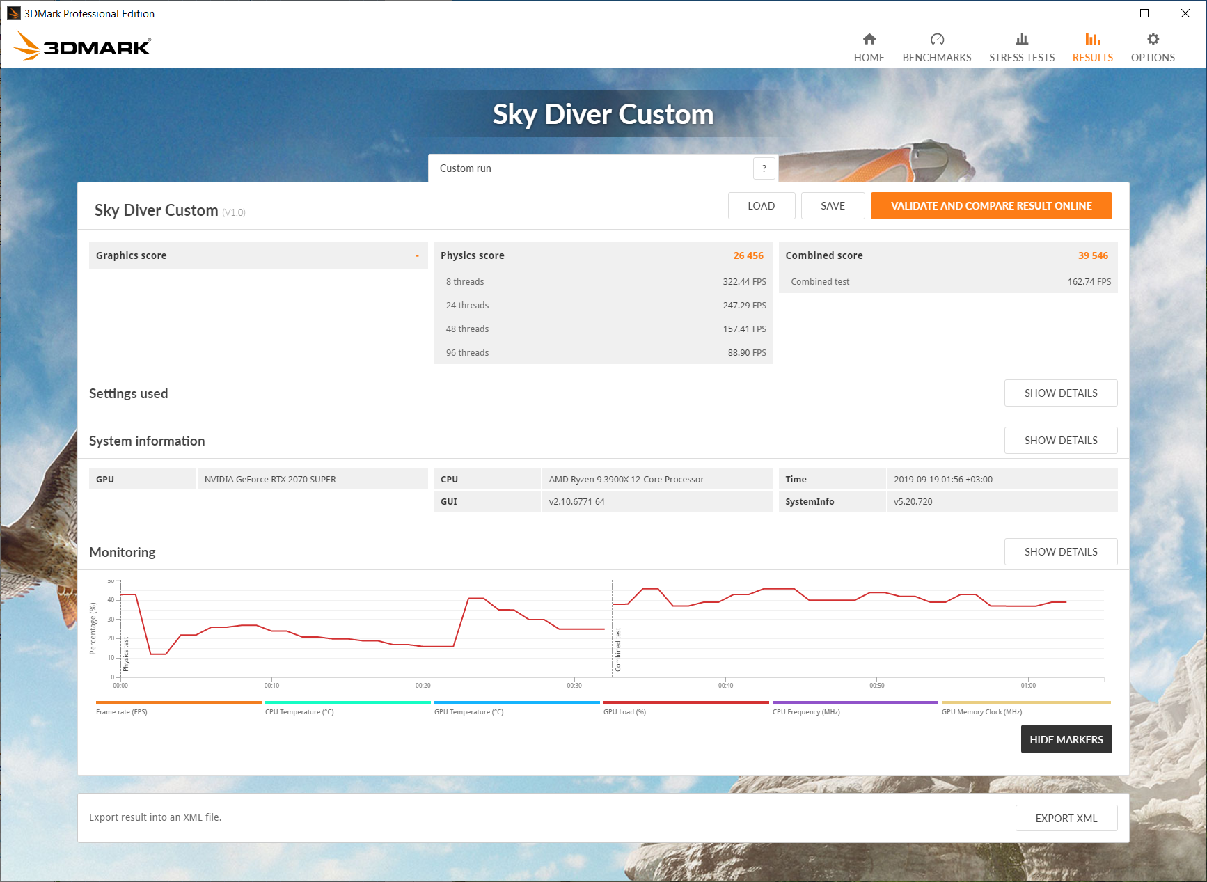 - 3DMark Sky Diver Physics / Combined CPU benchmark — 26456 / 39546