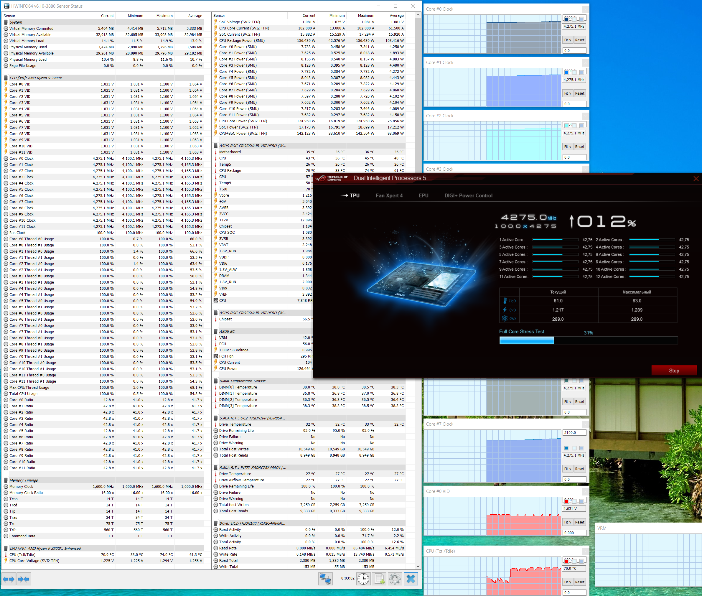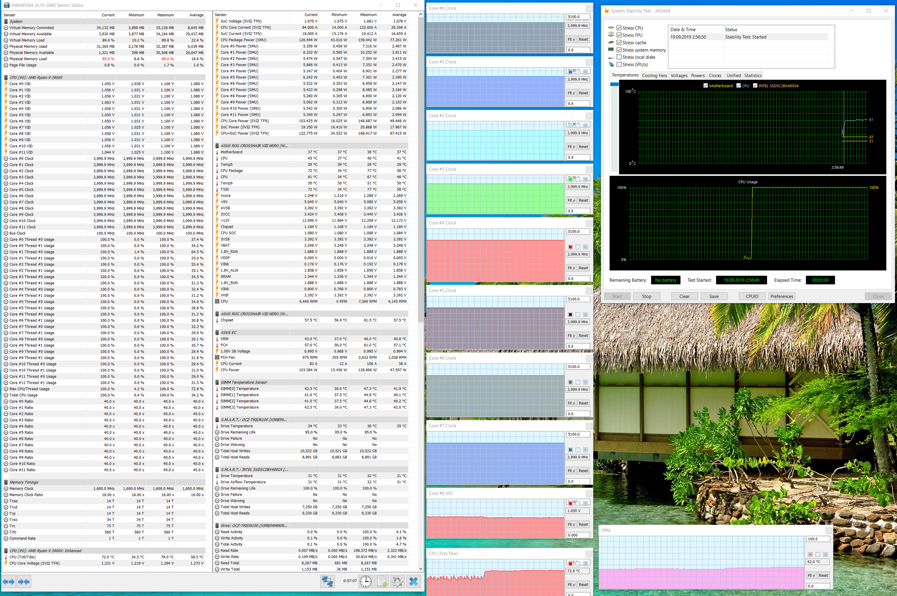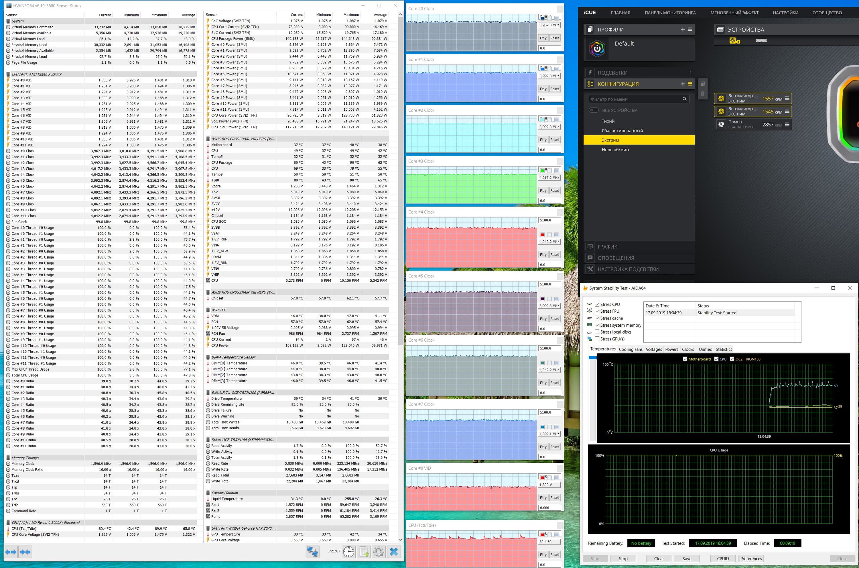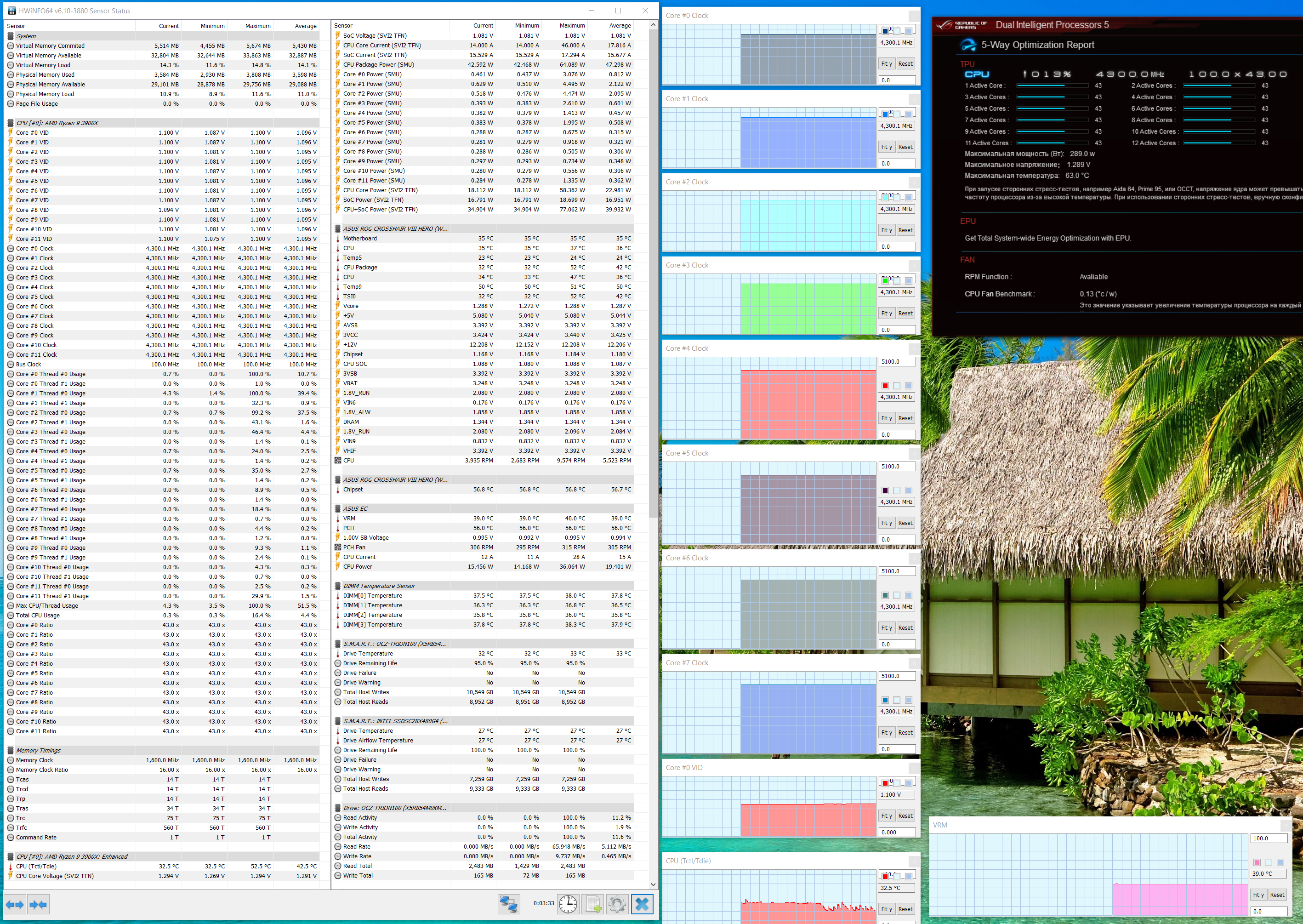 Надо сказать, что впервые я получил на том же CPU (у нас единственный экземпляр Ryzen 9 3900X на всю лабораторию) такие частоты на ядрах. Даже ранее побывавшие у нас на тестах более дорогие материнские платы не смогли достичь таких вершин! Все же «умный софт» плюс грамотная система питания — это прекрасно!