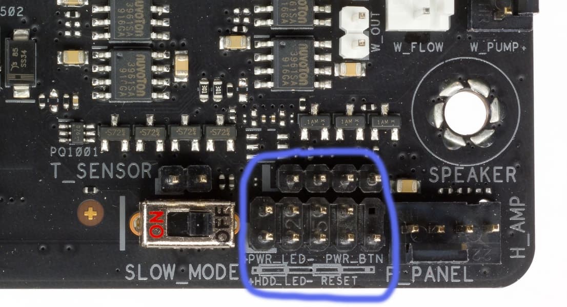 Разумеется, есть и традиционный набор штырьков FPanel для подключения проводов к передней (а сейчас уже часто и верхней или боковой или все это сразу) панели корпуса.