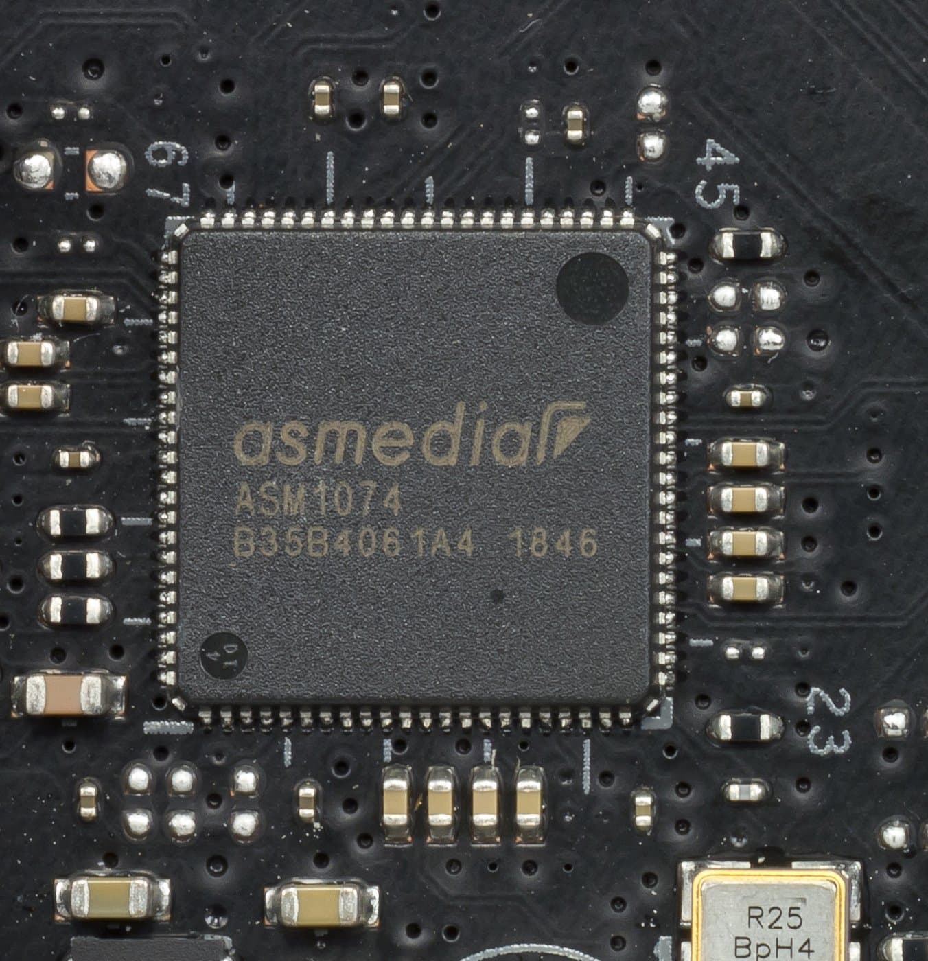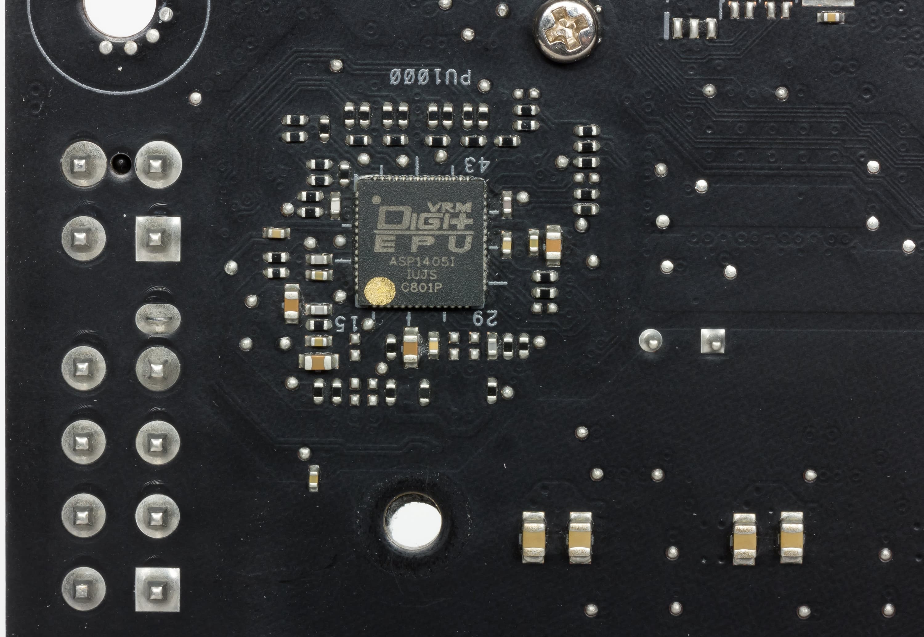На оборотной стороне установлено несколько микросхем контроллеров, мелкая логика, плюс металлическая платформа под сокетом для крепления СО. Обработан текстолит хорошо: во всех точках пайки острые концы срезаны.