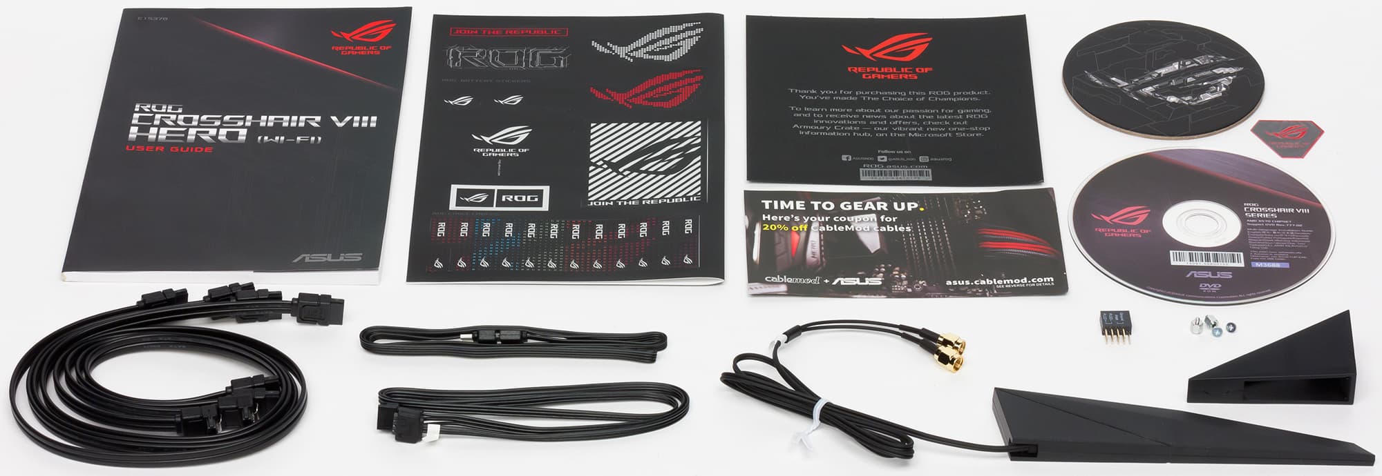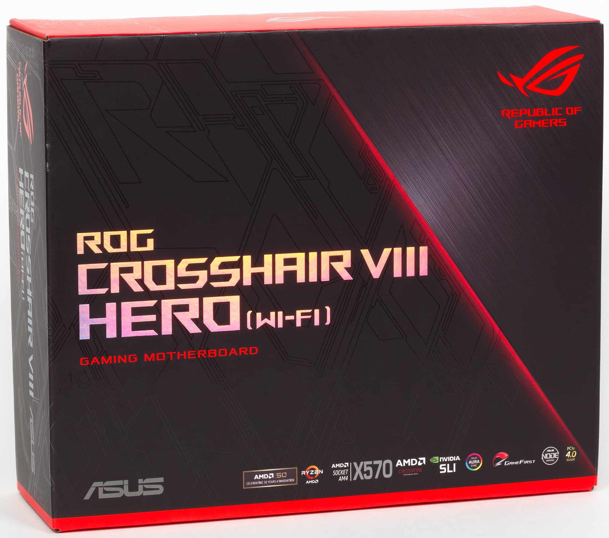 Asus ROG Crosshair VIII Hero (Wi-Fi), как и положено топовой плате, поставляется в большой коробке, открывающиеся наподобие ларца, имеющую строгую фирменную для ROG-серии расцветку.