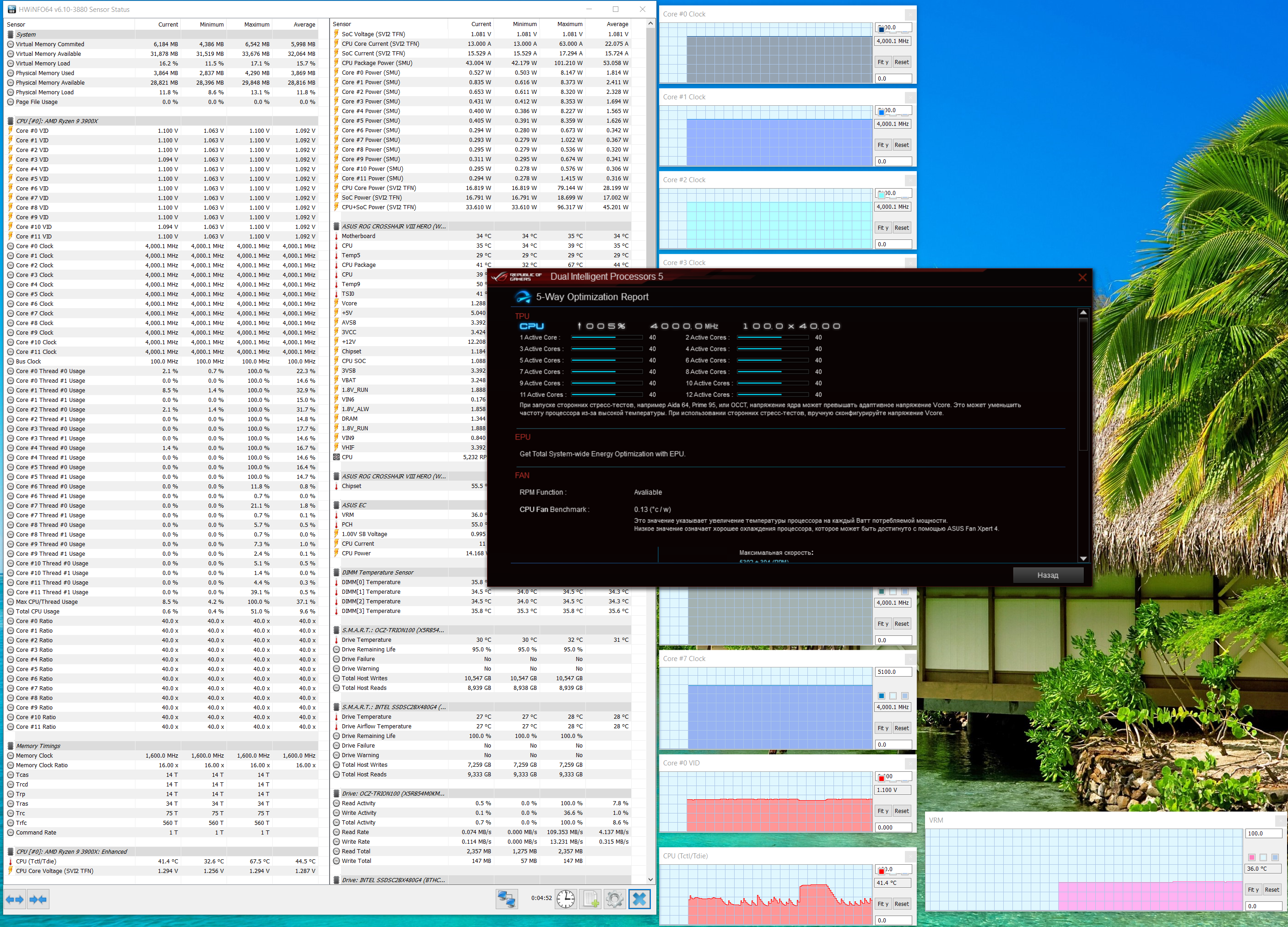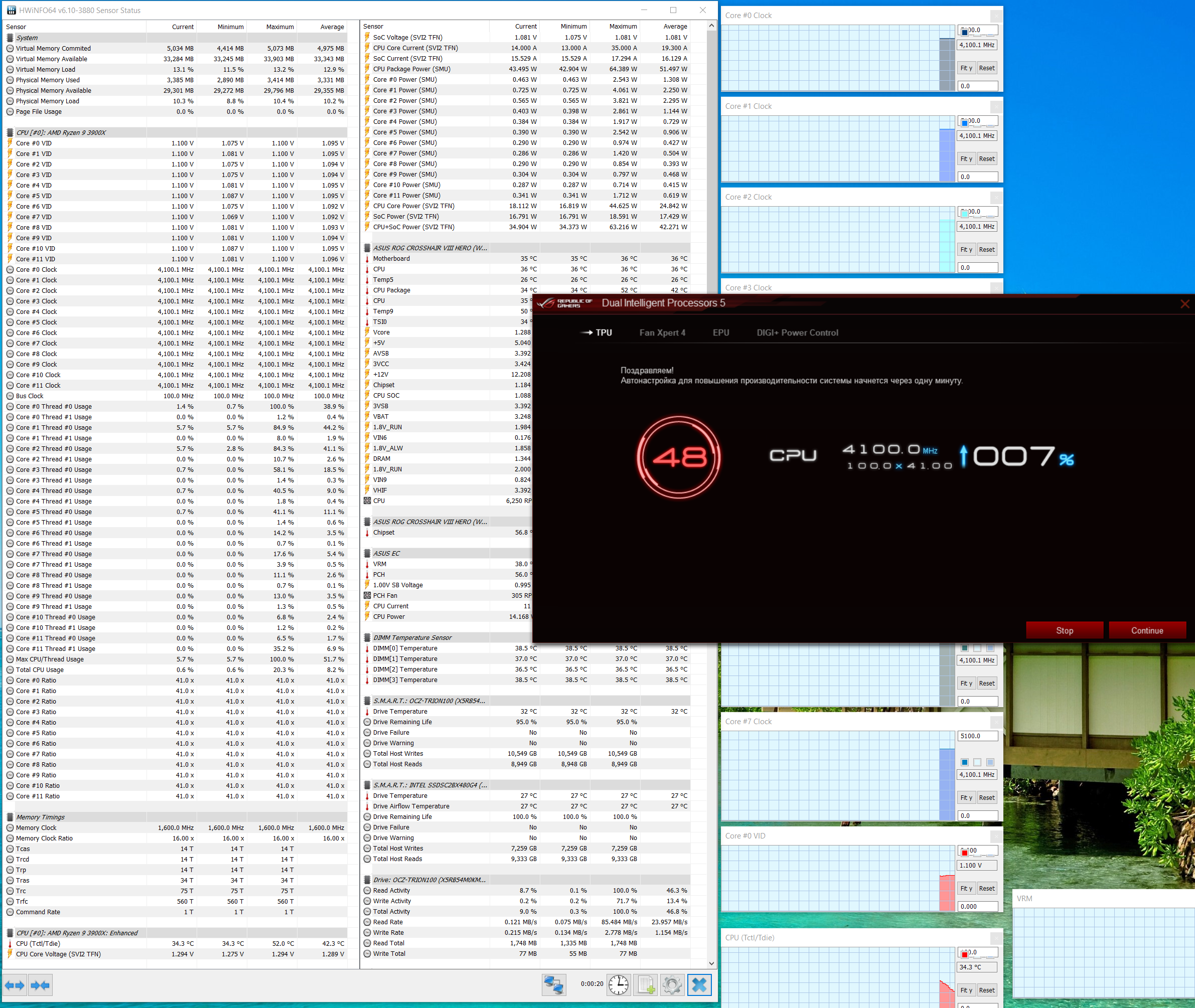 Если кто помнит настройки BIOS, о которых я рассказывал выше, то там есть некая кнопка F11, включающая автооверклокинг по некоему сценарию, заданному в UEFI. Я оставил режим «Asus Optimal», поэтому программа начала свои «ощупывания» с 4000 МГц по процессору.