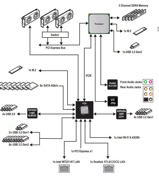 | Сетевые контроллеры | 1 × Intel WGI211AT (Ethernet 1 Гбит/с) 1 × Realtek RTL8125CG (Ethernet 2,5 Гбит/с) 1 × Intel Dual Band Wireless AX200NGW/CNVi (Wi-Fi 6: 802.11a/b/g/n/ac/ax (2,4/5 ГГц) + Bluetooth 5.0) |
