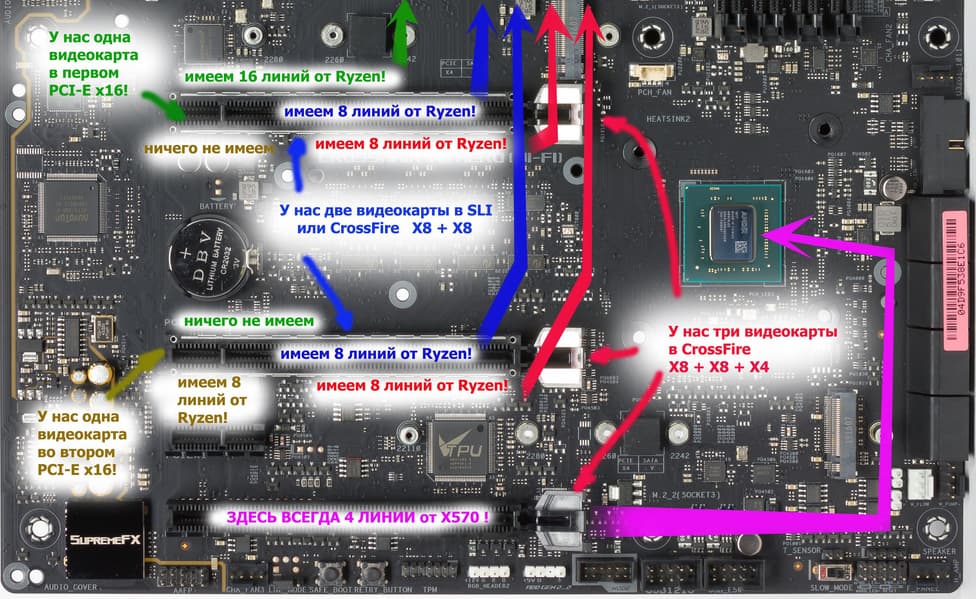 То есть полноценно получит 16 линий PCI-E только одиночная видеокарта, а если установить две видеокарты, объединив из в Nvidia SLI или AMD /CrossFire, то процессор выдаст уже по 8 линий PCI-E на каждый слот. А если уже кому-то очень захочется заполучить комбинацию из трех видеокарт (на сегодня это актуально только для технологии AMD CrossFireX), то по 8 линий получат только первые две карты, а третья карты получит 4 линии от чипсета. Собственно, третий слот PCI-Ex16 (по общему счету — четвертый) всегда получает х4 от X570 (работает независимо от наличия/отсутствия видеокарт в первых двух). Следует особо отметить, что если использовать одиночную карту, но во втором слоте, то 16 линий мы не получим, к сожалению, будет только х8.