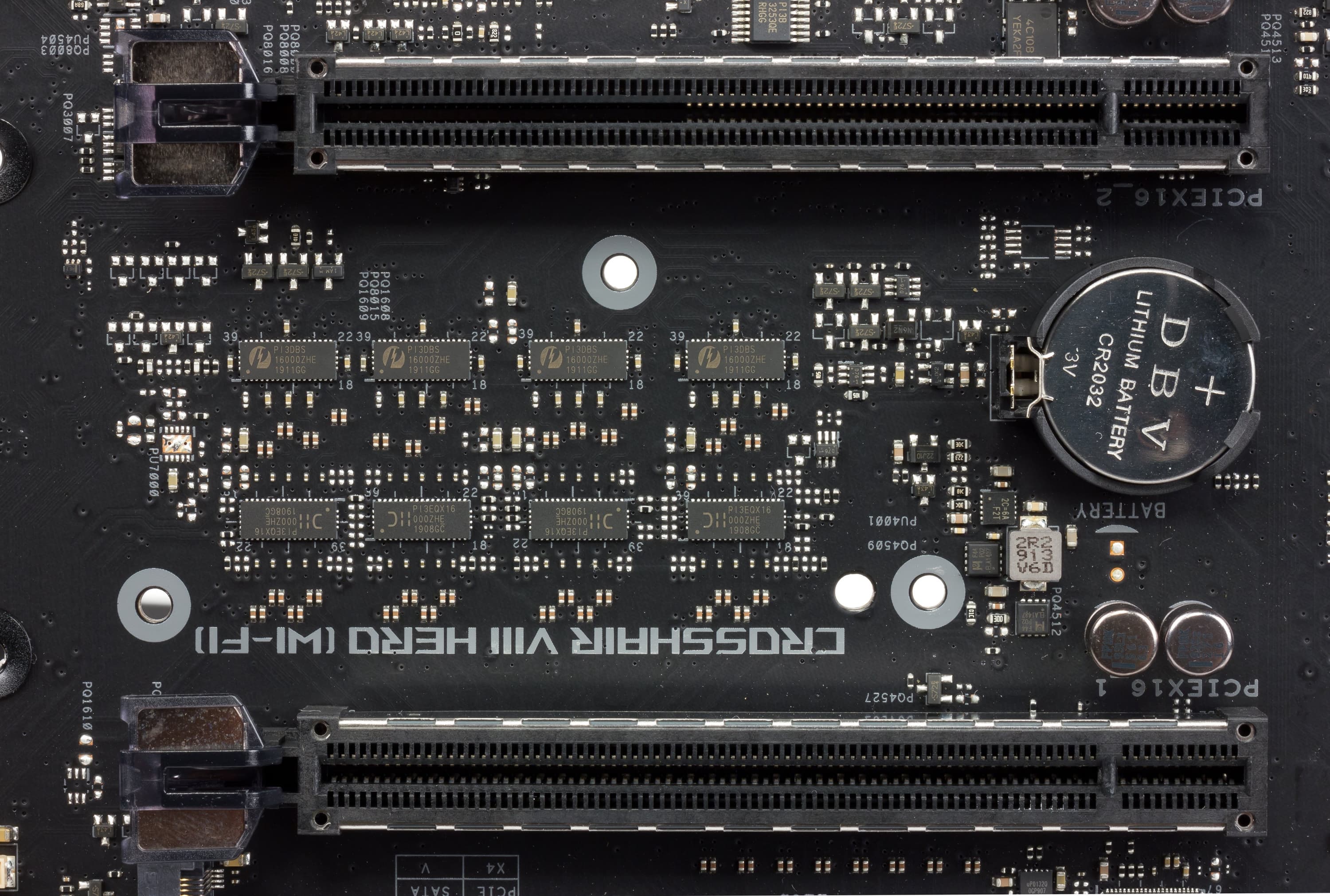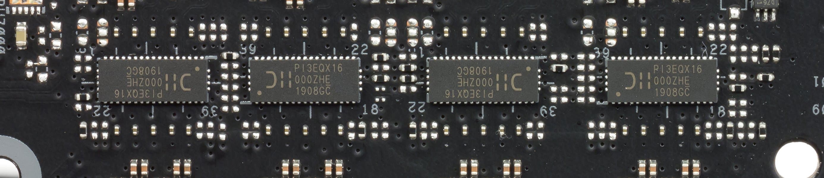 Распределением линий PCI-E между слотами в случае использования более одной видеокарты занимаются мультиплексоры PI3EQX16 от Pericom.