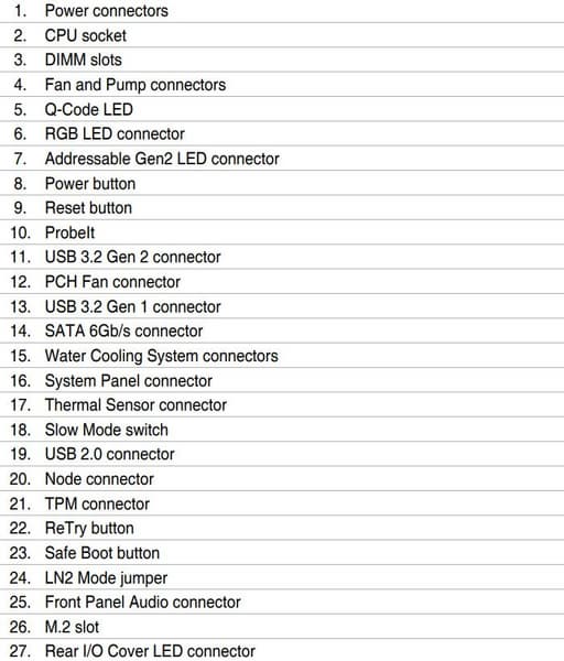 | Прочие внутренние элементы | 24-контактный разъем питания EATX 1 8-контактный разъем питания EATX12V 1 4-контактный разъем питания EATX12V 1 слот M.2 (E-key), занят адаптером беспроводных сетей 1 разъем для подключения порта USB 3.2 Gen2 Type-C 1 разъем для подключения 2 портов USB 3.2 Gen1 2 разъема для подключения 4 портов USB 2.0 8 разъемов для подключения 4-контактных вентиляторов (поддержка помп ЖСО) 2 разъема для подключения неадресуемой RGB-ленты 2 разъема для подключения адресуемой ARGB-ленты 1 разъем аудио для передней панели корпуса 1 разъем TPM 1 разъем NODE 2 разъема для подключения управления с передней панели корпуса 1 разъем включения режима LN2 1 переключатель Slow Mode 1 кнопка Safe_boot 1 кнопка Retry 1 кнопка включения питания Power 1 кнопка перезагрузки Reset |