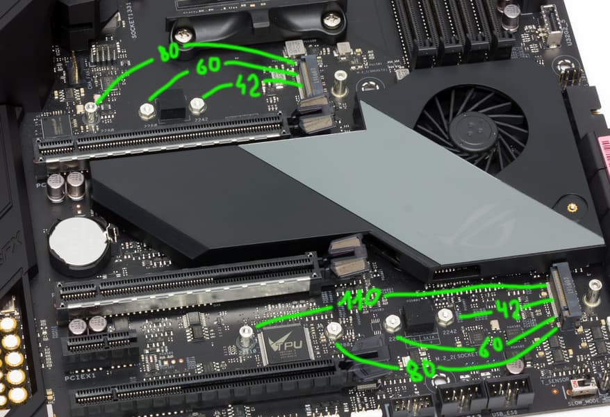 Верхний слот поддерживает M.2-модули до 80 мм длины (2242, 2260, 2280), а второй обслуживает модули всех длин (до 22100 включительно).