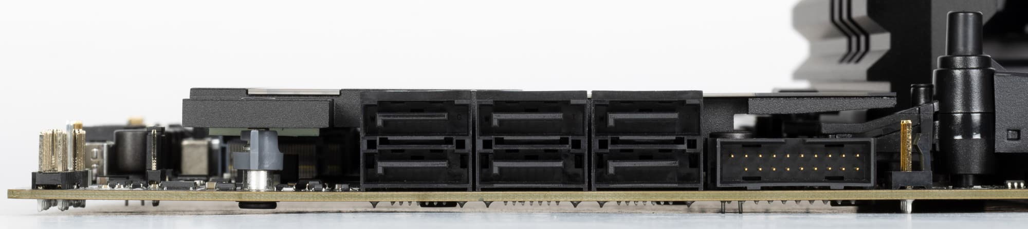 Всего у платы 6 разъемов Serial ATA 6 Гбит/с + 4 слота для накопителей в форм-факторе M.2 (плюс 1 слот M.2 на отдельной карте).
