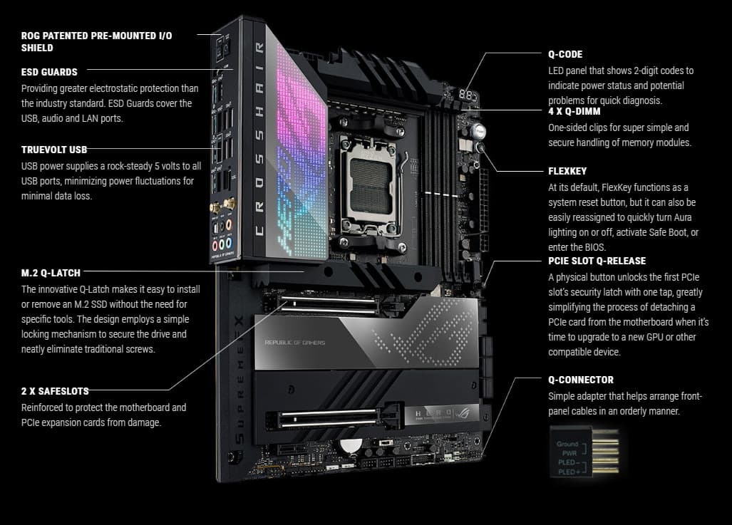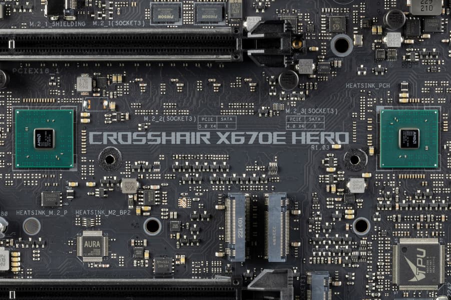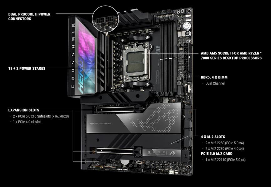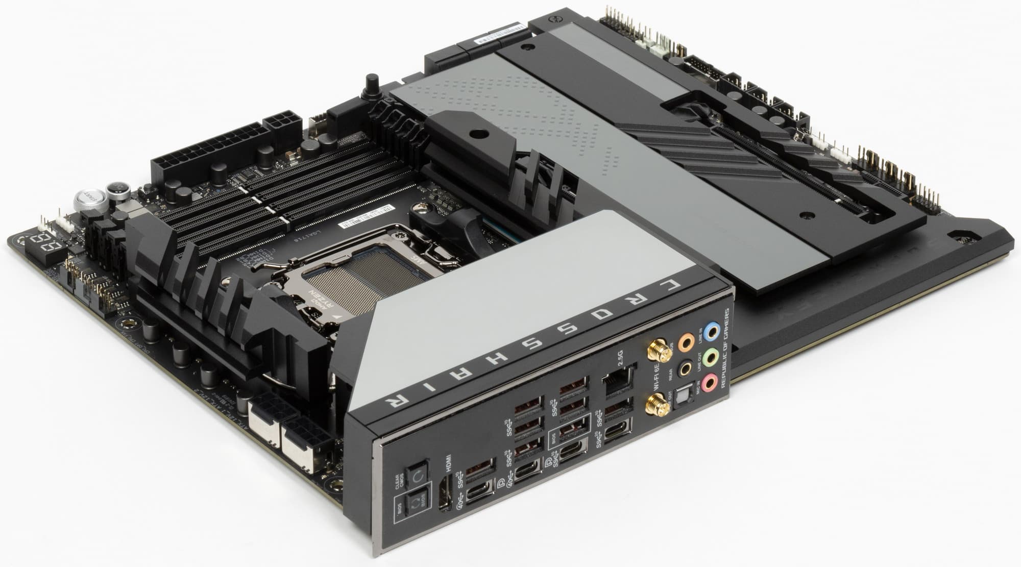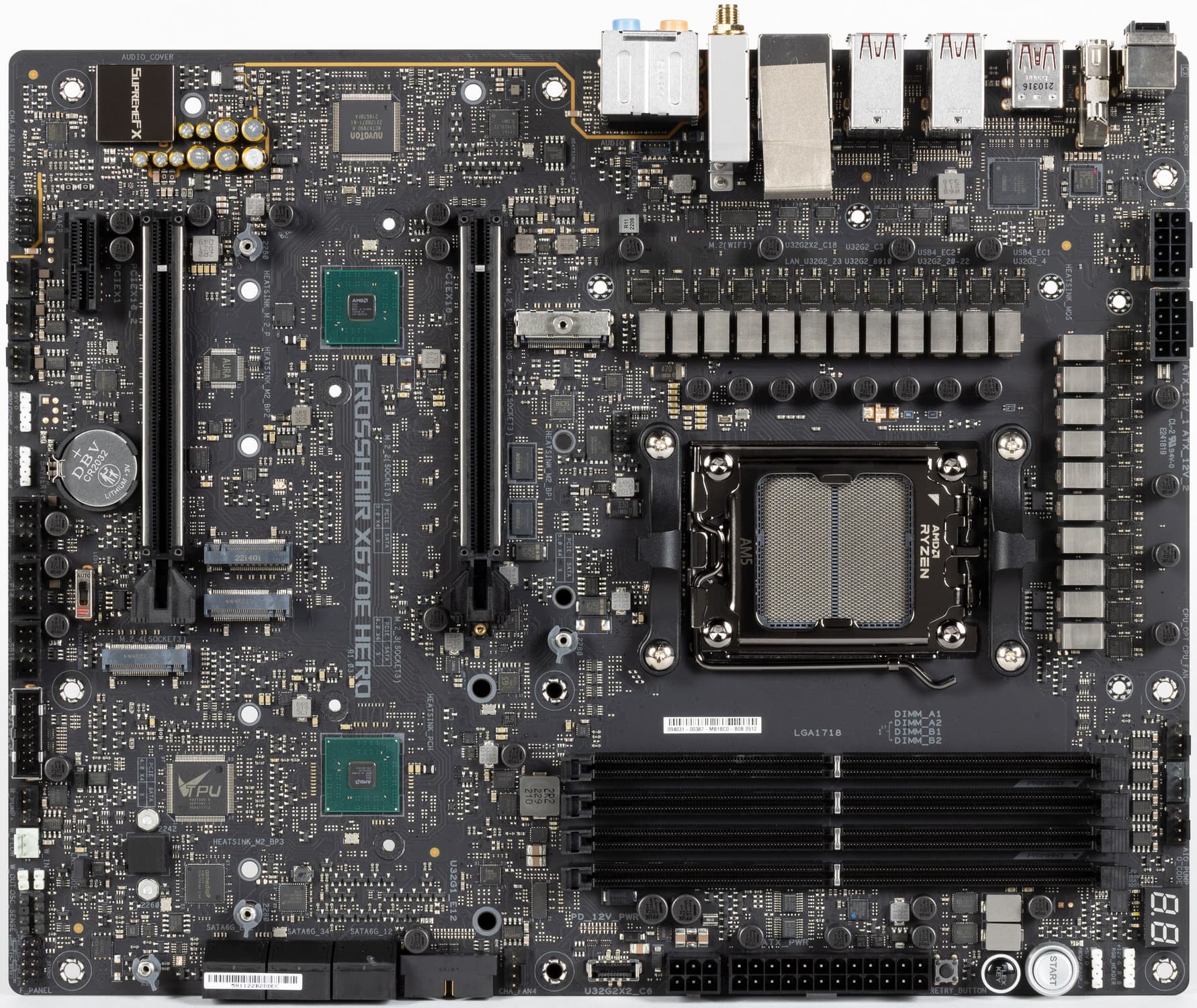 У Asus ROG Crosshair X670E Hero имеется 23 порта USB разных видов, включая 11 очень быстрых USB 3.2 Gen2, из которых два поддерживают Thunderbolt 4, а также два USB 3.2 Gen2×2 в виде внутреннего и обычного портов Type-C. Плата предлагает 2 слота PCIe х16, которые получают от процессора 16 линий PCIe версии 5.0, также имеется 1 слот PCIe x1 (подключенный к чипсету).