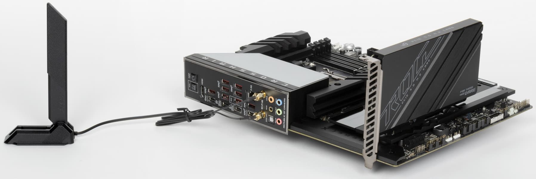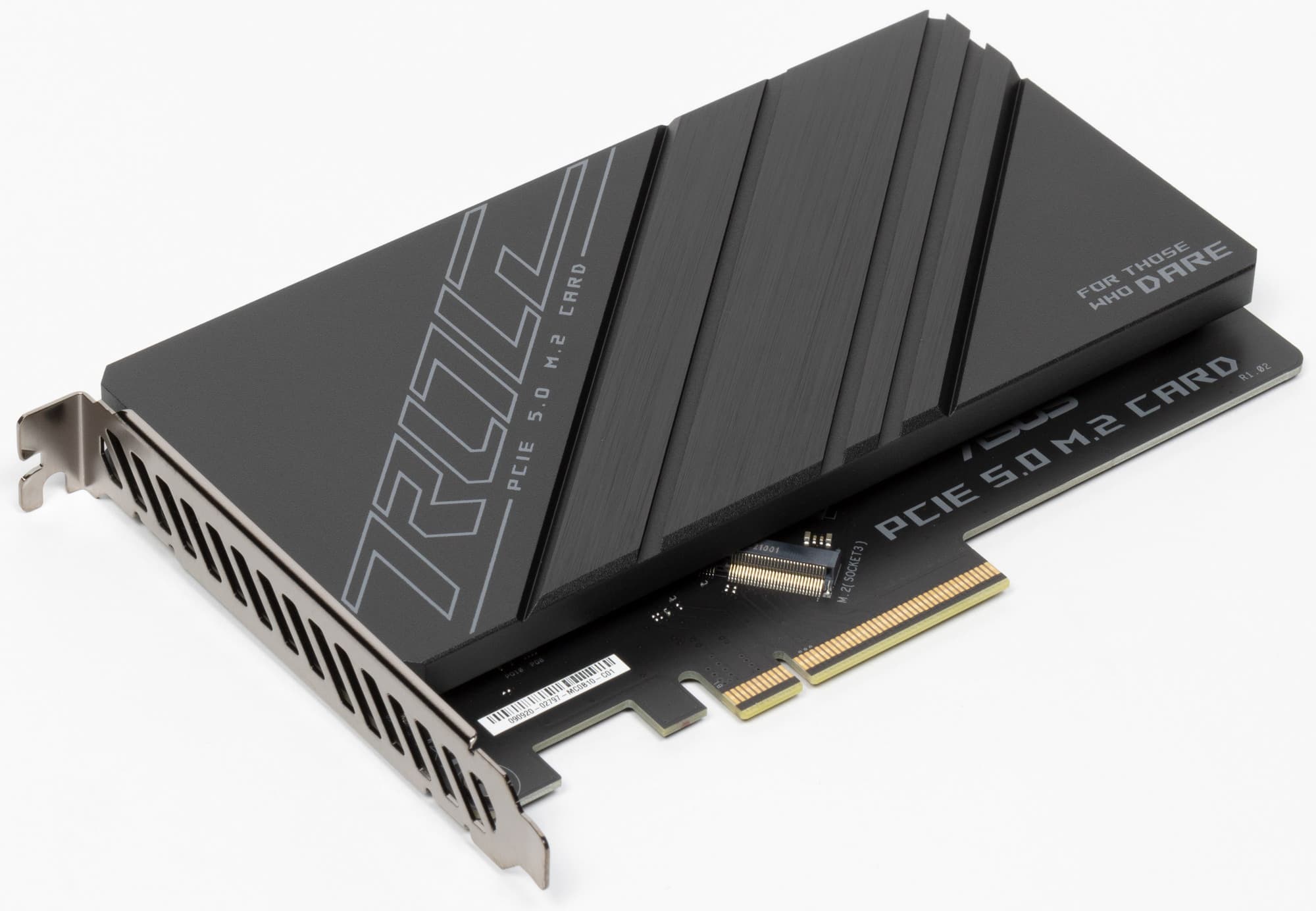 Забегая вперед, скажу, что в комплекте с матплатой идет карта ROG PCIe 5.0 M.2. Она несет на себе один слот М.2, рассчитанный также на PCIe 5.0 (до х4), так что ее можно установить в один из вышеупомянутых слотов PCIe. Но об этом ниже.