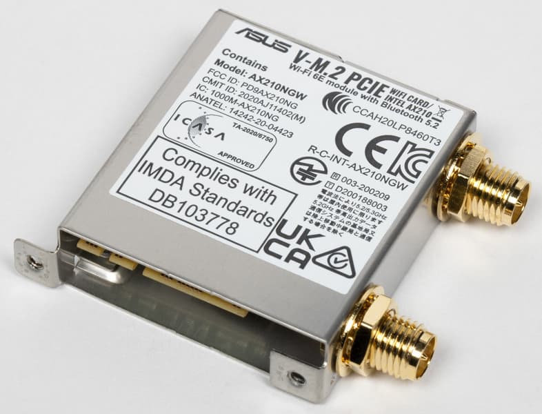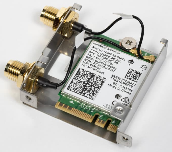 Имеется и комплексный беспроводной адаптер на контроллере Intel AX-210NGW, через который реализованы Wi-Fi 6E (802.11a/b/g/n/ac/ax) и Bluetooth 5.2. Он установлен в слот M.2 (E-key), и его разъемы для привинчивания выносных антенн выведены на заднюю панель.