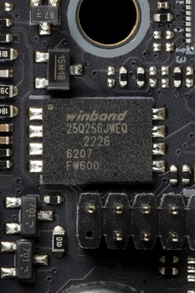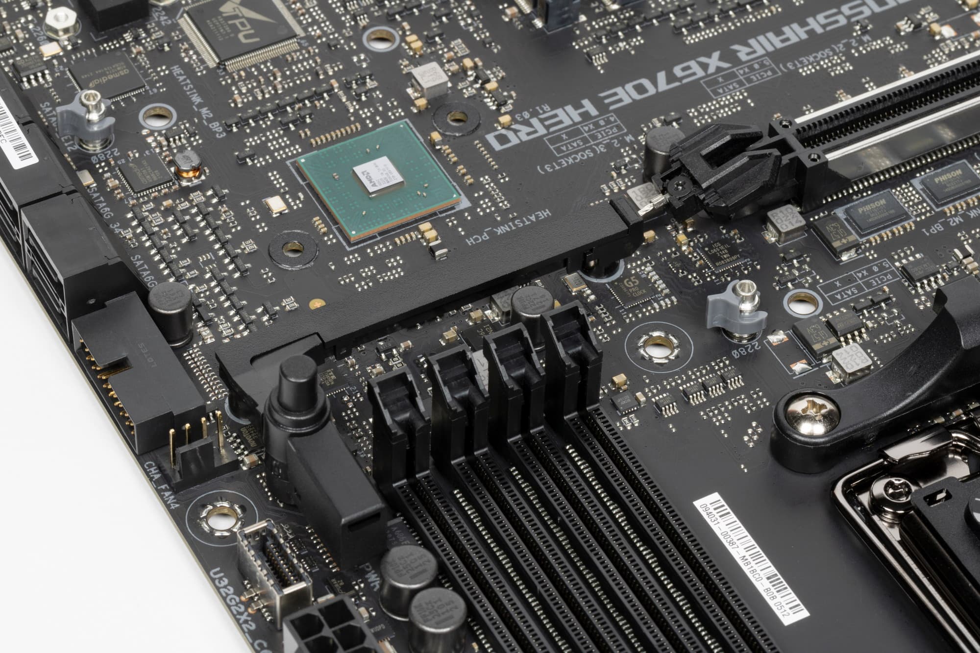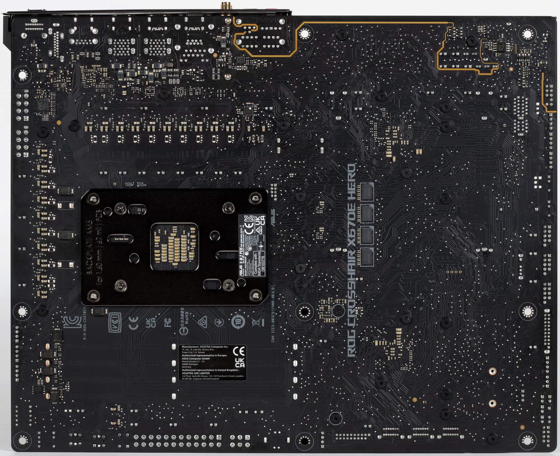 На оборотной стороне расположено несколько контроллеров и традиционная некоторая логика. Текстолит обработан хорошо: во всех точках пайки не только острые концы срезаны, но и все неплохо отшлифовано. Защитной пластины (бэкплейта) нет. Интересно отметить здесь, что на подобной материнской плате Hero, но на базе Intel Z790 бэкплейт имеется. Странный подход дизайнеров Asus.