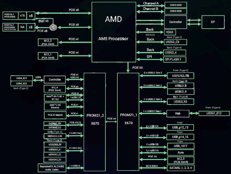 Чипсет X670/X670E получил сильно больше как портов, так и линий PCIe, нежели предшественник, и чтобы не получить одну очень горячую микросхему, памятуя проблему чипсета X570, которому на начальных порах требовался весьма шумный вентилятор, AMD разделила функциональность на две микросхемы по принципу: «восходящее» и «нисходящее» соединения. «Восходящий» чип подключен к процессору через PCIe 4.0 x4, а «нисходящий» к «восходящему» через другое соединение PCIe 4.0 x4. Обе микросхемы произведены силами ASMedia.