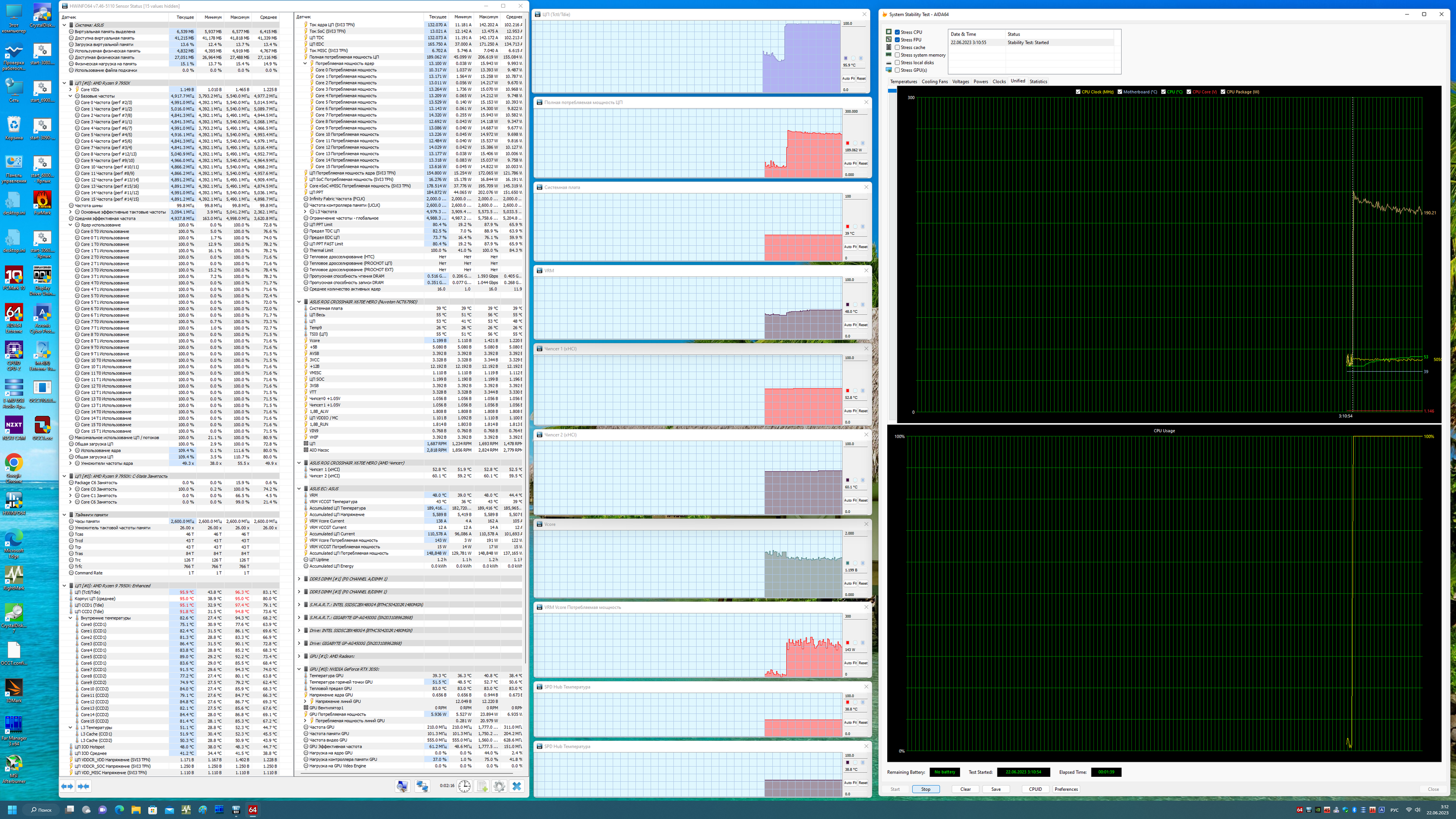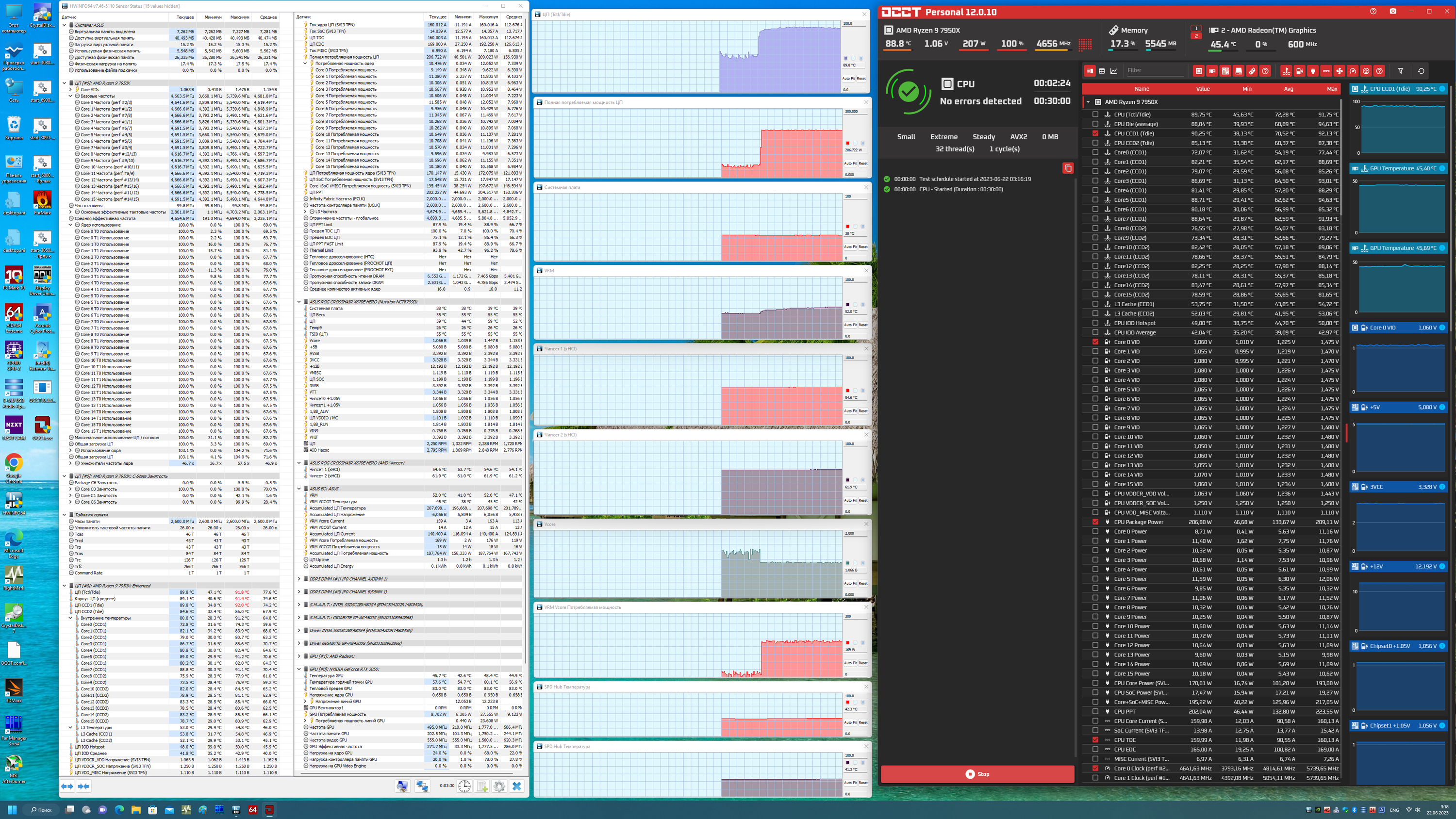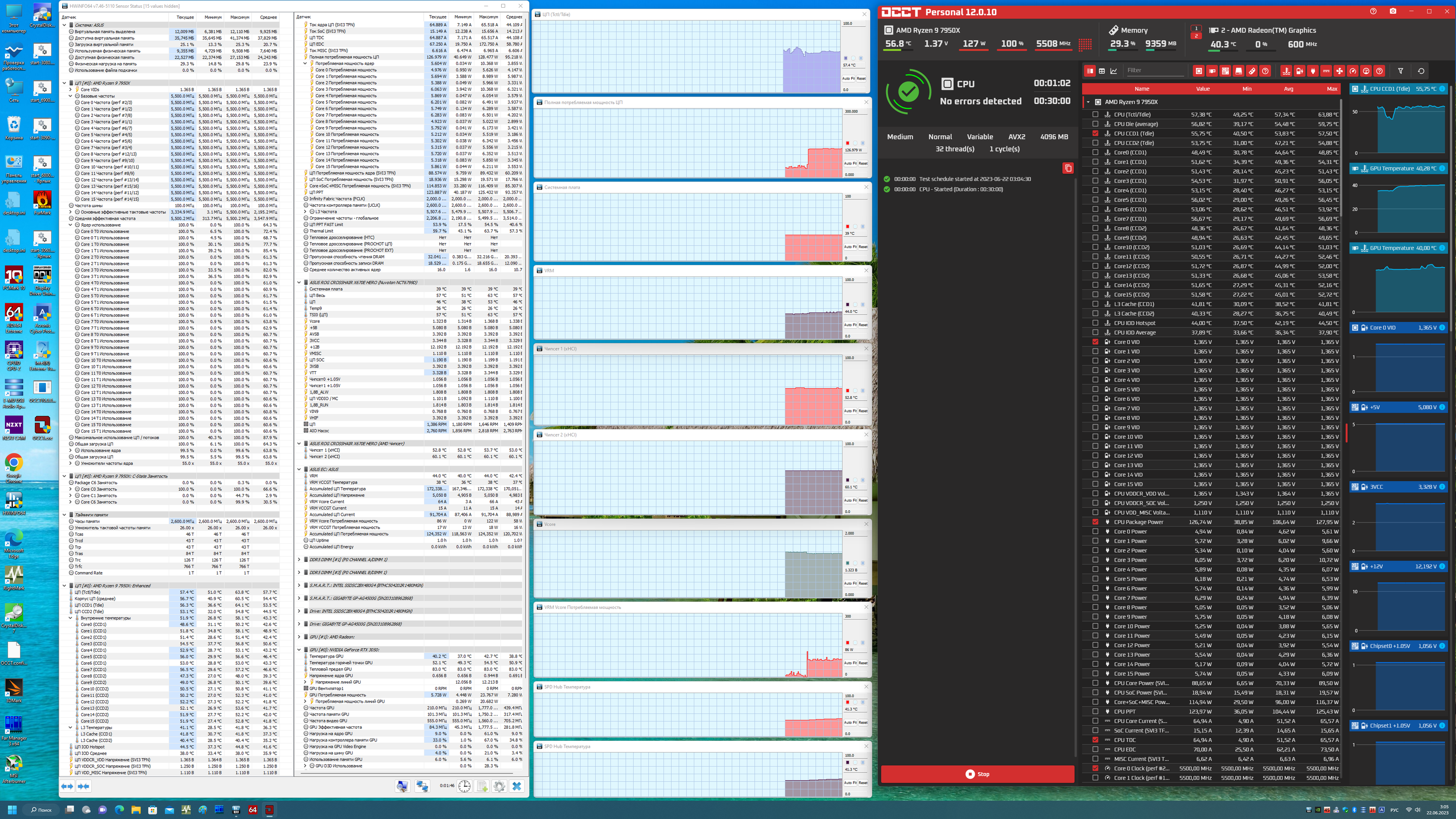 Даже очень сильно нагружающая процессоры программа AIDA не так сильно «мучала» наш 7950X, и потому у него частоты работы ядер временами даже были чуть выше (а потребление чуть меньше).