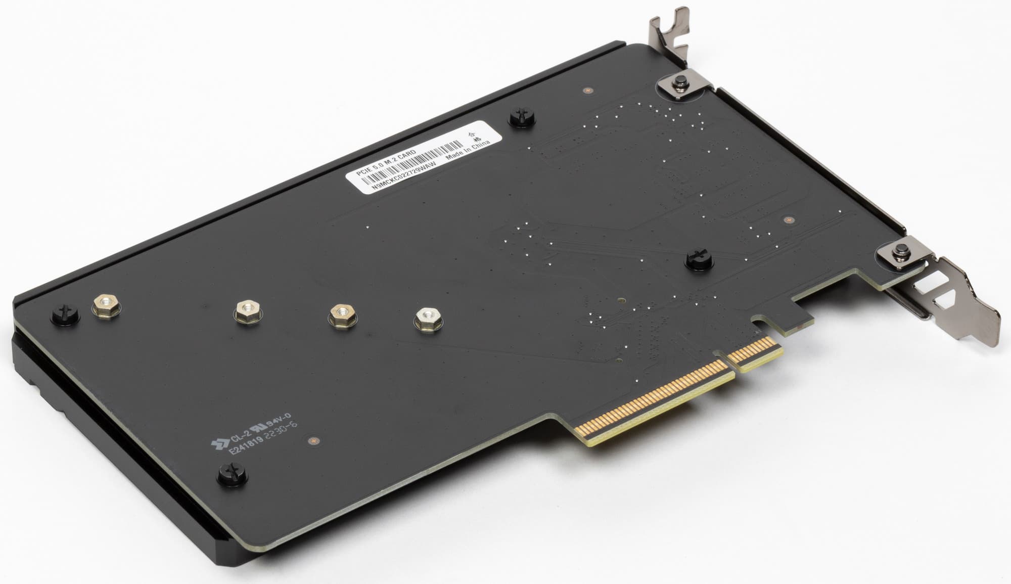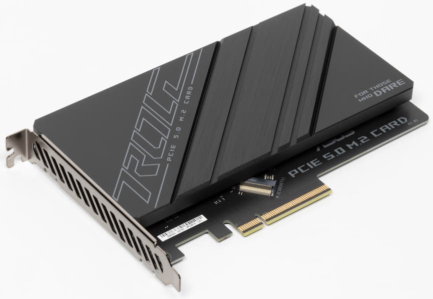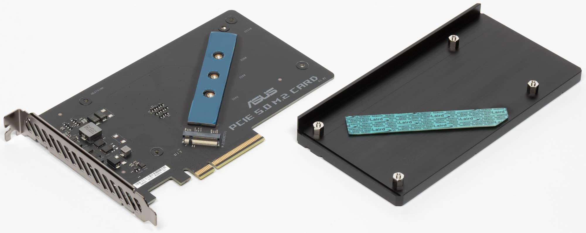 Слот М.2 на ROG PCIe 5.0 M.2 card также имеет охлаждение в лице крышки самой карты. Собственно, по этой причине и рекомендуют ставить эту карту в первый PCIe слот: обычно внутренная продувка в корпусе наиболее эффективна посредине последнего.