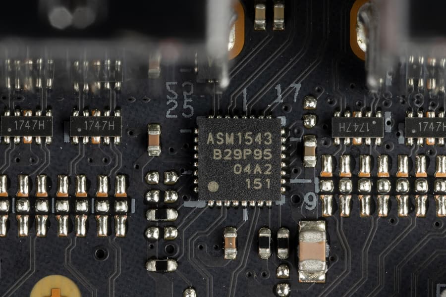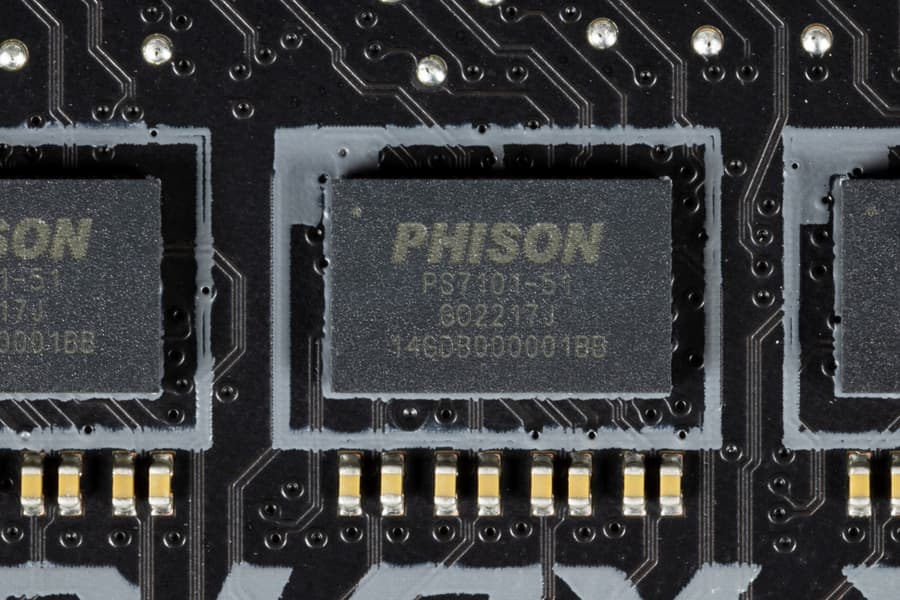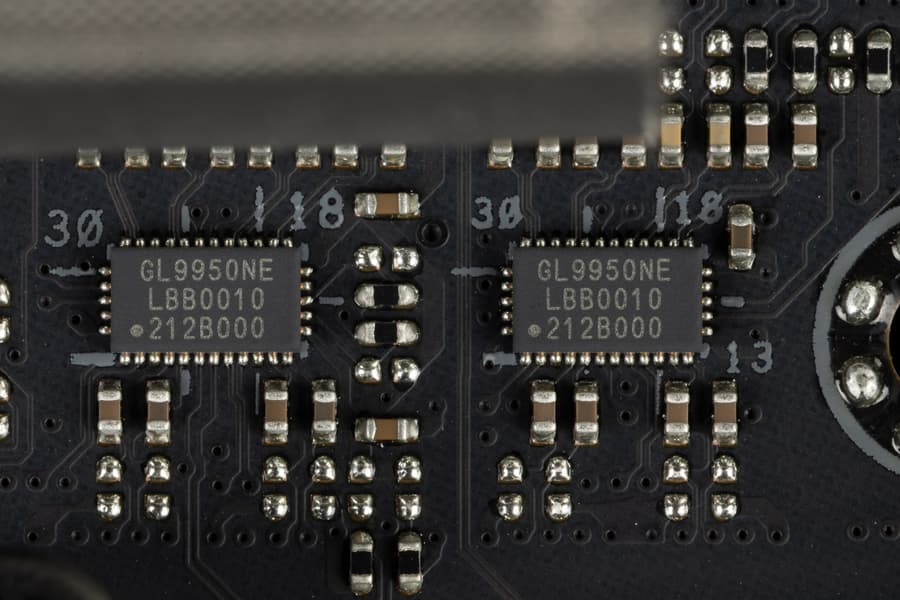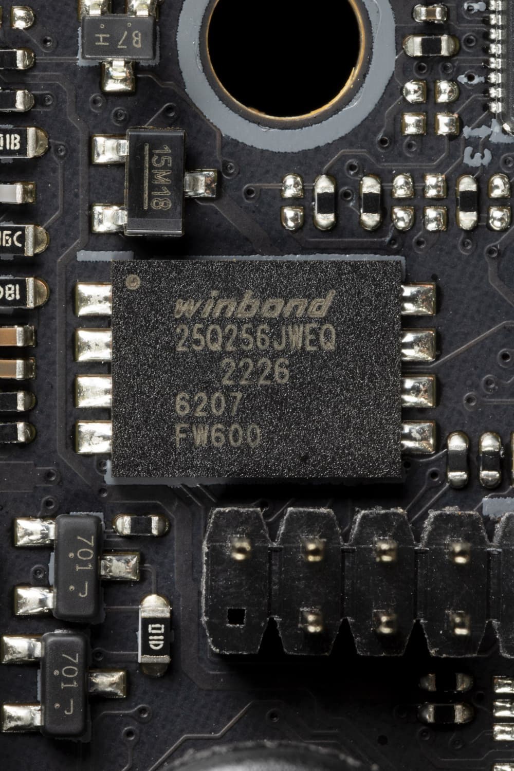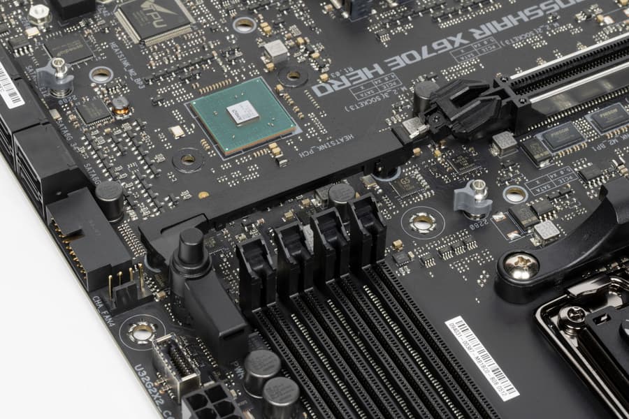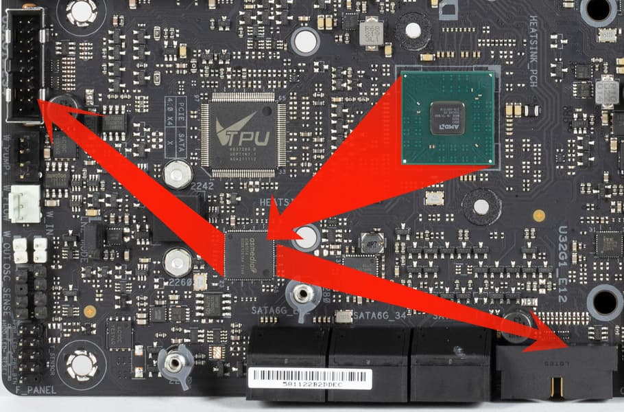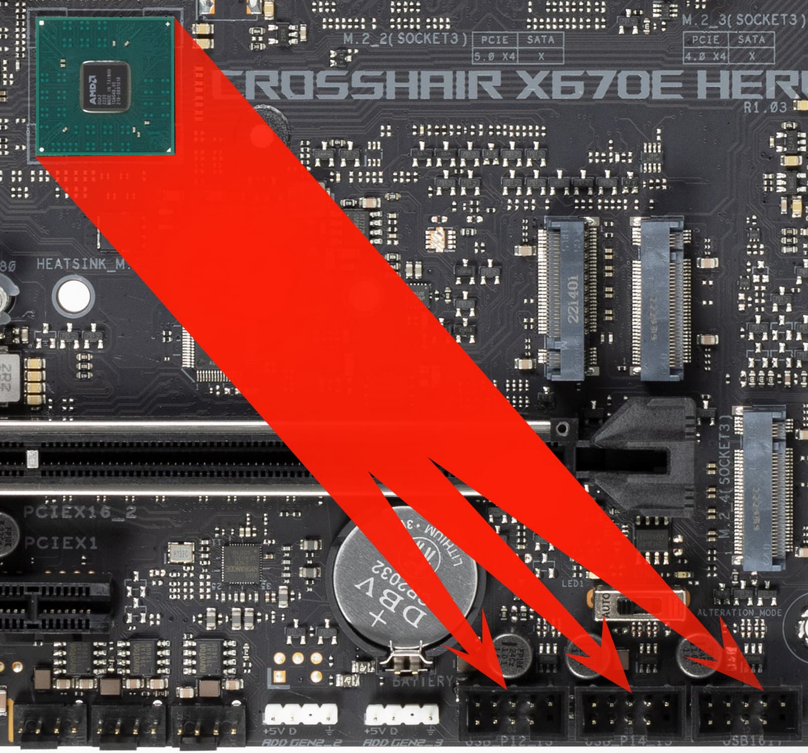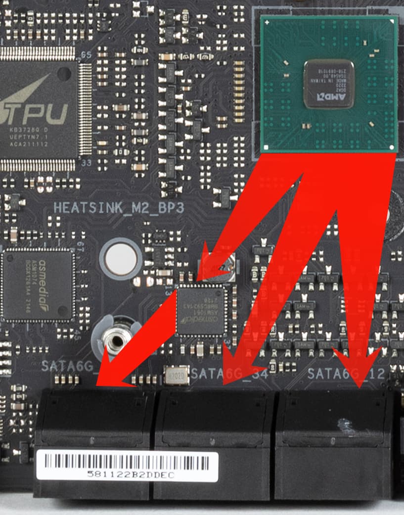 А два порта SATA 5,6 (промаркированные как E1, E2) реализованы через хаб ASM1061 от ASMedia (на него ушла 1 линия PCIe от X670E).