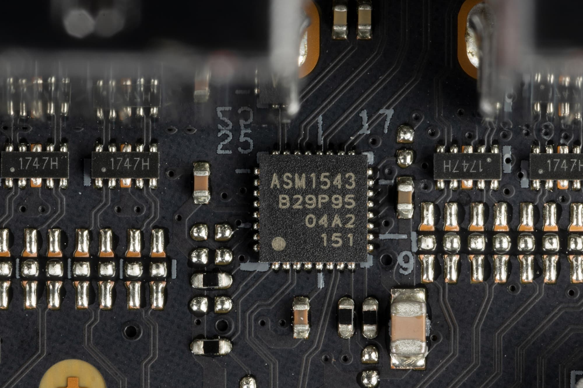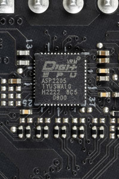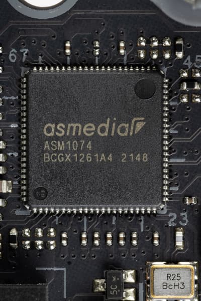 - 4 порта USB 3.2 Gen1: все реализованы через контроллер ASMedia ASM1074 (на него потрачена 1 линия USB 2.0 от CPU) и представлены 2 внутренними разъемами на материнской плате (каждый на 2 порта);