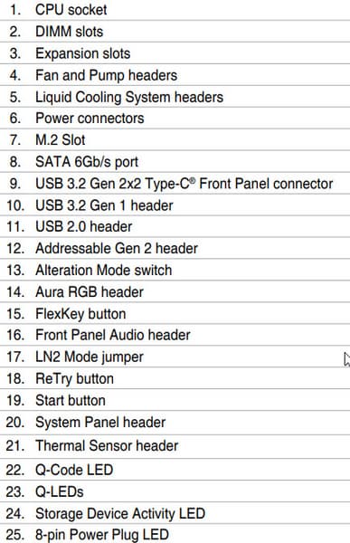 | Прочие внутренние элементы | 24-контактный разъем питания ATX 2 8-контактных разъема питания EPS12V 1 6-контактный разъем питания PCIe 1 слот M.2 (E-key), занят адаптером беспроводных сетей 1 разъем для подключения порта USB 3.2 Gen2x2 Type-C 2 разъема для подключения 4 портов USB 3.2 Gen1 3 разъема для подключения 6 портов USB 2.0 8 разъемов для подключения 4-контактных вентиляторов и помп ЖСО 1 разъем для подключения неадресуемой RGB-ленты 3 разъема для подключения адресуемой ARGB-ленты 1 разъем аудио для передней панели корпуса 1 кнопка OC Retry 1 переключатель версии PCIe 1 разъем для термодатчикa 3 разъема подключения фирменных помп СВО Asus 1 разъем для подключения управления с передней панели корпуса 1 кнопка включения питания Power 1 кнопка перезагрузки Reset |