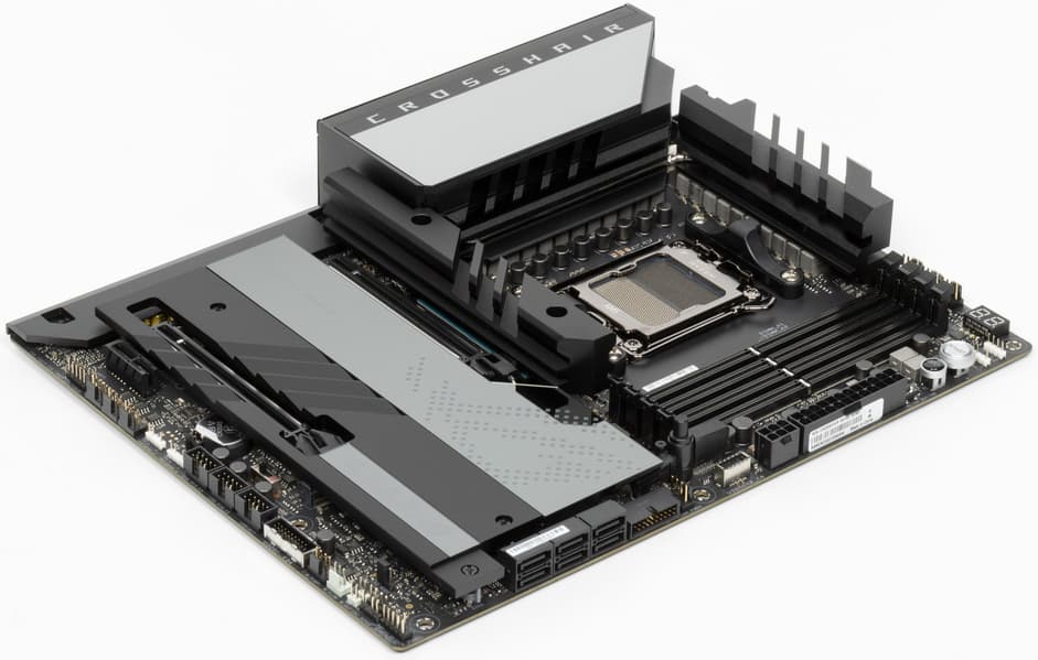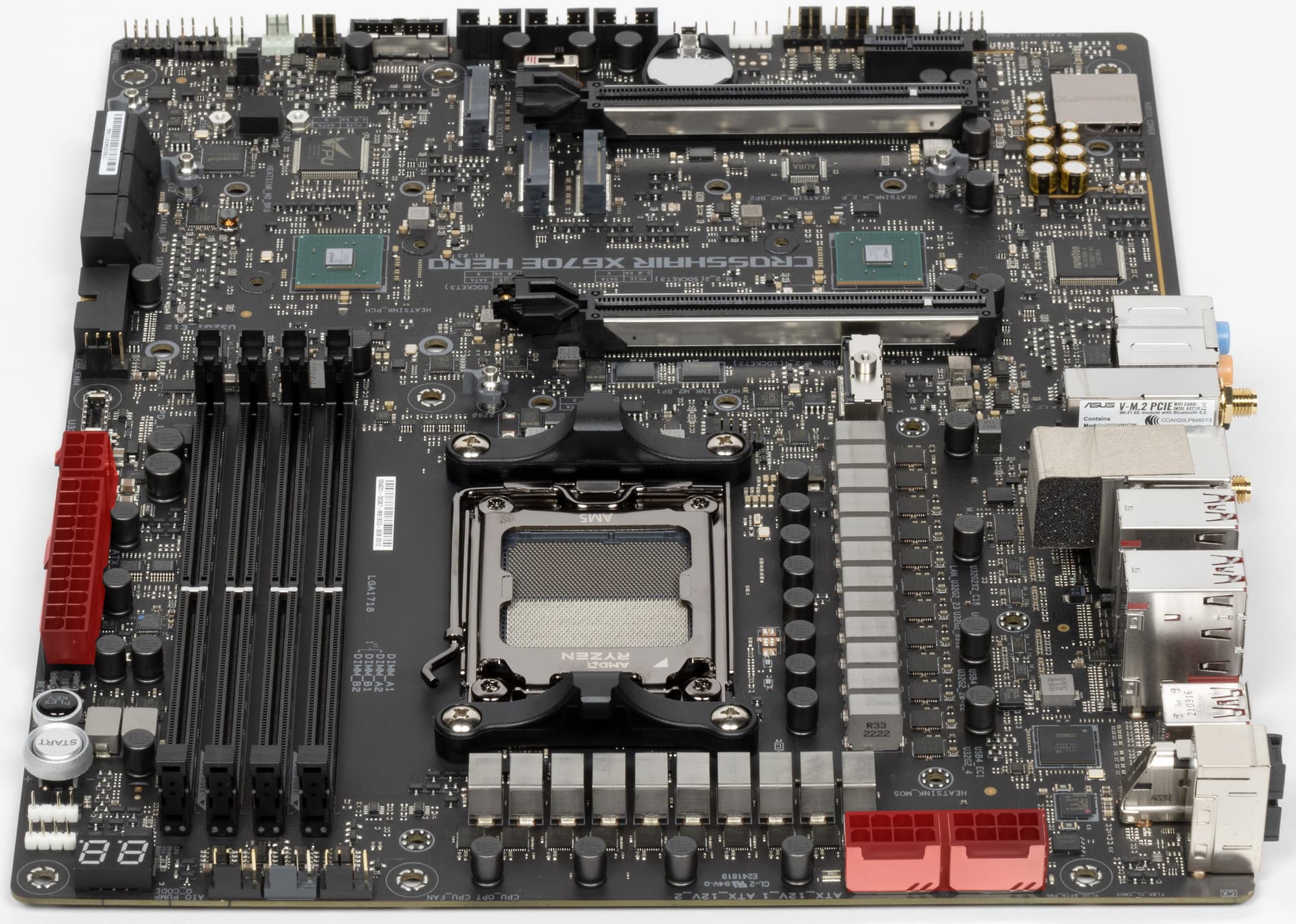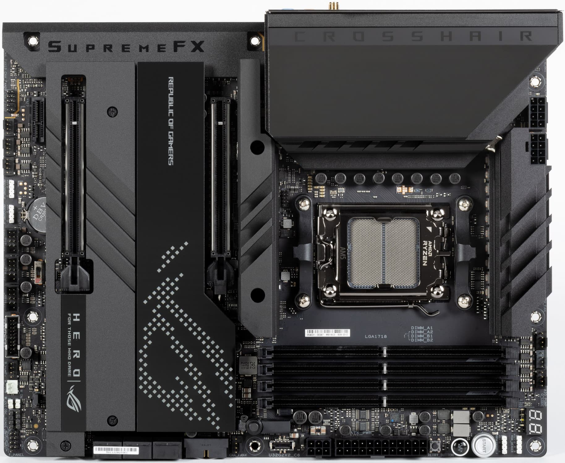 Переходим к самой материнской плате Asus ROG Crosshair X670E Hero, которая относится к топовому суббренду ROG, поэтому перед нами почти флагман (мы помним, что самая-самая в этой линейке — материнка c суффиксом Extreme, а Hero — на ступень ниже).