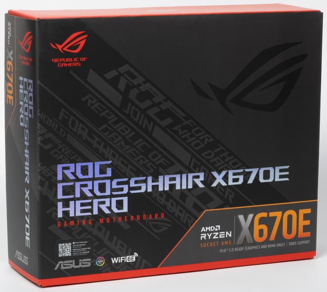 Asus ROG Crosshair X670E Hero поставляется в традиционной толстой черно-красной коробке фирменного дизайна серии ROG. Комплект размещен под платой в отдельном отсеке.