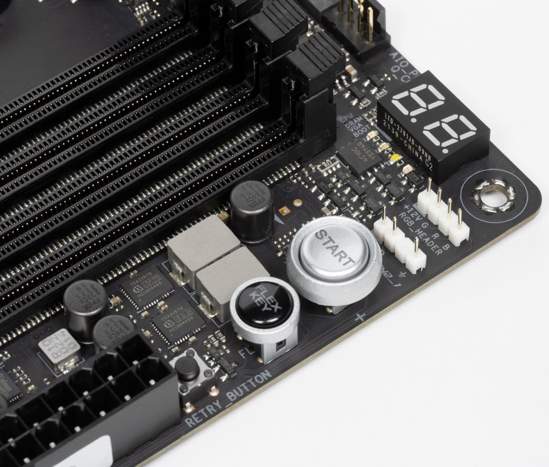 Для питания платы на ней предусмотрены 4 разъема: в дополнение к 24-контактному ATX (он на правой стороне платы (на фото — слева) здесь есть еще два 8-контактных EPS12V и один 6-контактный PCIe (для поддержки питания USB 3.2 Gen2x2 (Type-C) порта, через который могут заряжаться мобильные устройства в режиме быстрой зарядки).